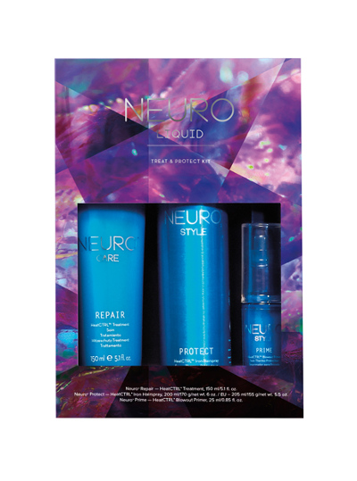Paul Mitchell Christmas Gift Set – Neuro Liquid Treat Protect Kit This ALL NEW Neuro Treat Protect Kit is more than amazing for anyone who loves to style with heat! Protecting hair from Blow Drying, Straightening irons curlers.Gift Set Contents:Paul Mitchell NEW Neuro Care Repair HeatCTRL Treatment 150ml Paul Mitchell NEW Neuro Style Protect HeatCTRL Iron Hairspray 205ml Paul Mitchell NEW Neuro Style Prime HeatCTRL Blowout Primer 25mlNeuro Care Repair HeatCTRL TreatmentFor all hair types. HeatCTRL technology helps provide exceptional thermal protection intensive repair for heat-stressed strands. The rich formula leaves hair smooth conditioned with brilliant shine.Directions: Apply to clean, damp hair comb through. Leave for 3-5 minutes then rinse style as desired. For extra hydration leave on for 10-15 minutes. For best results use with the complete Neuro system. Neuro Style Protect HeatCTRL Iron HairsprayFor all hair types. HeatCTRL technology helps provide exceptional thermal protection for styling irons. This lightweight hairspray delivers shine, hold humidity resistance.Directions: Spray onto dry hair before using a hot iron to help protect from damage. Then reapply to lock in the shine the look. For best results use with the complete Neuro system. Neuro Style Prime HeatCTRL Blowout PrimerFor all hair types. HeatCTRL technology helps provide exceptional thermal protection against styling tools. This strand-perfecting primer controls your blow-dry for silky-smooth results.Directions: Apply a small amount to clean, damp hair blow-dry. Style as desired. For best results use with the complete Neuro system.