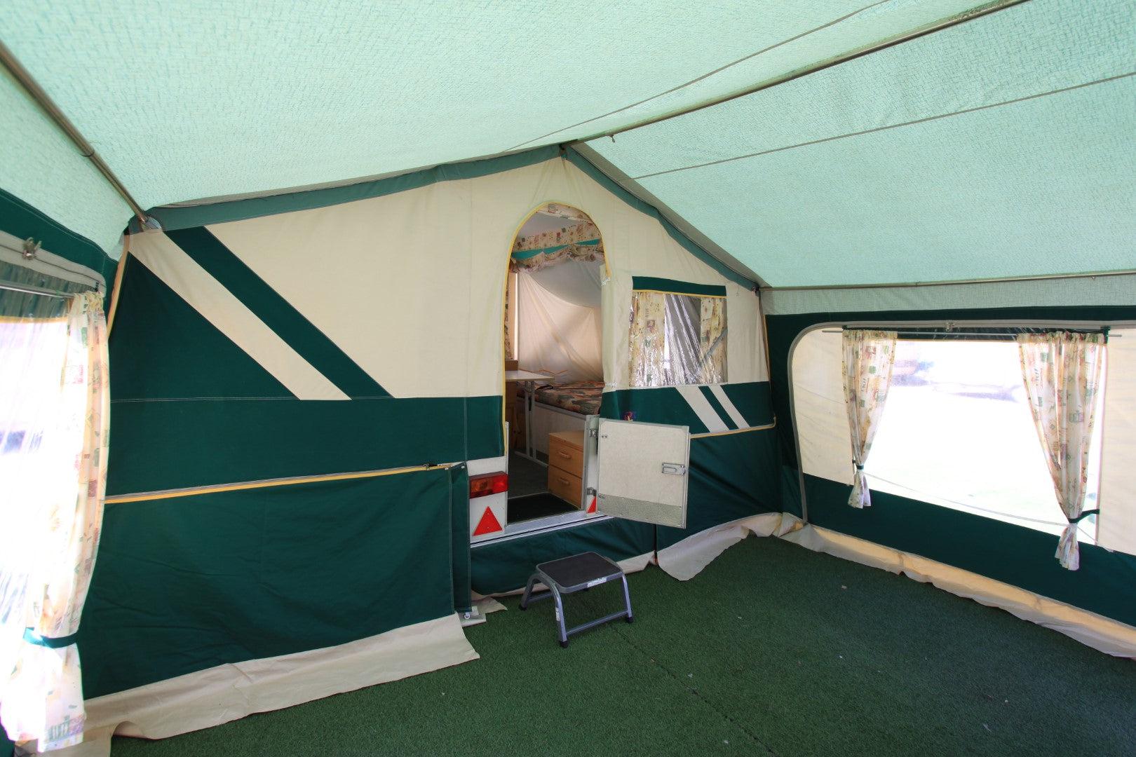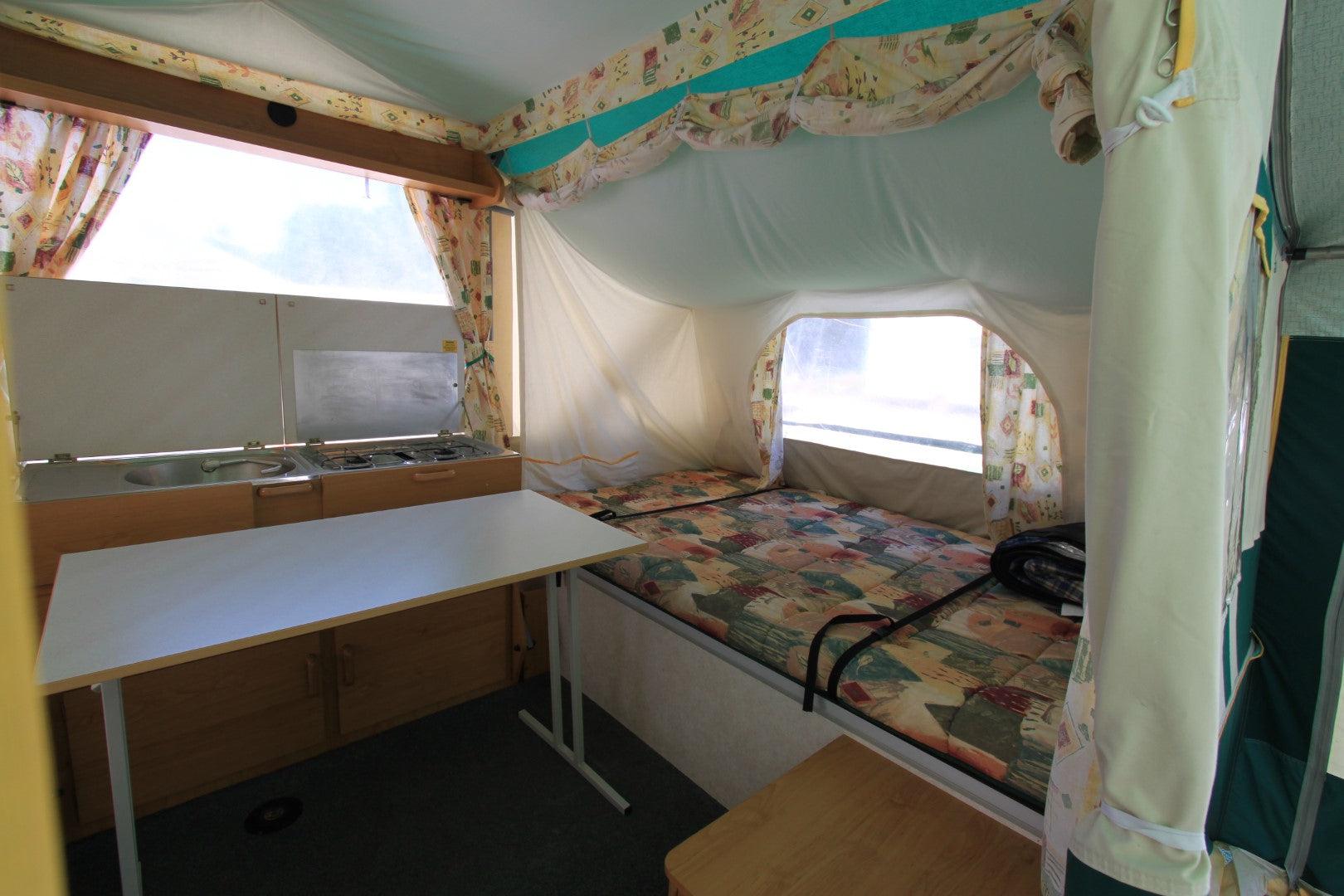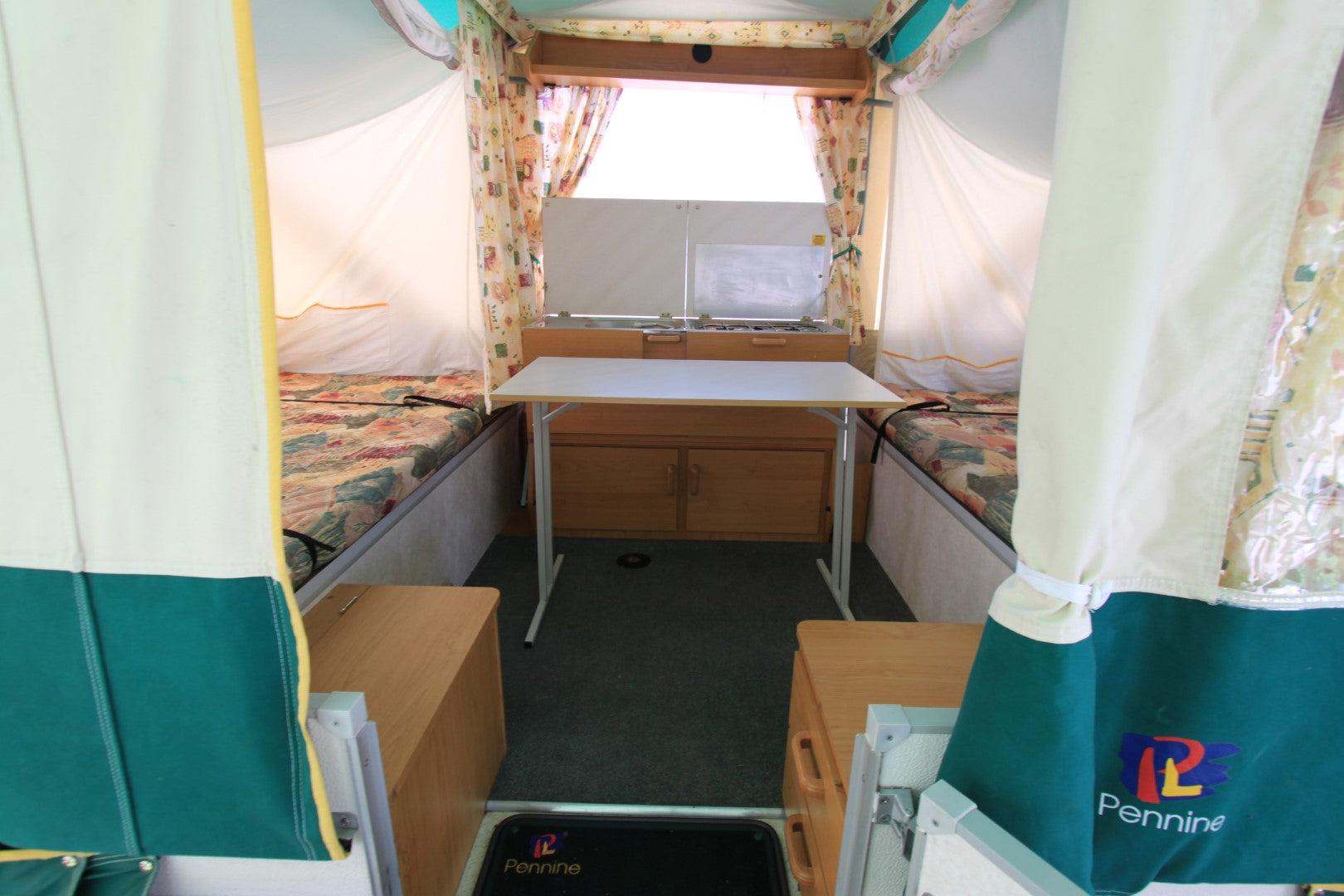Pennine Aztec – 2/4 Berth Folding Camper. Braked trailer. Cantilever Cooker unit, easy to put up and down ( no lifting ). Max towing weight of just 700kgs. Trailer comes with under bed storage skirt for one side. Trailer seems solid and tidy, canvas is in excellent condition, save for a couple of nicks here and there ( nothing of concern ). The main cabin erects quickly and as the canvas attaches to the trailer and bed boards ( unlike trailer ‘tents’ where the cabin canvas reaches to the ground ), there is no pegging of the canvas which means pitching can be either on grass or hard standing. Offered with full safety checks and with a 3 month warranty.