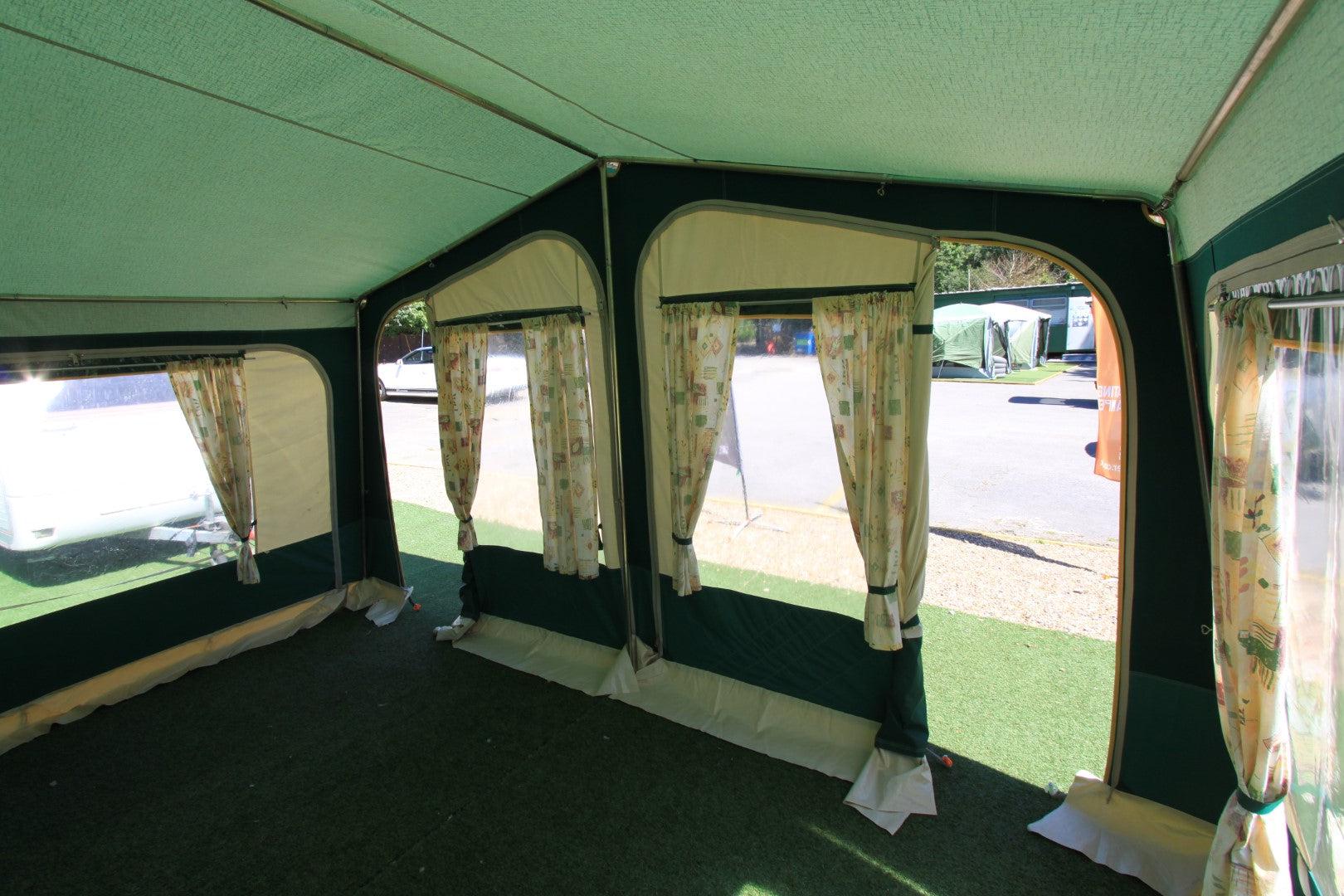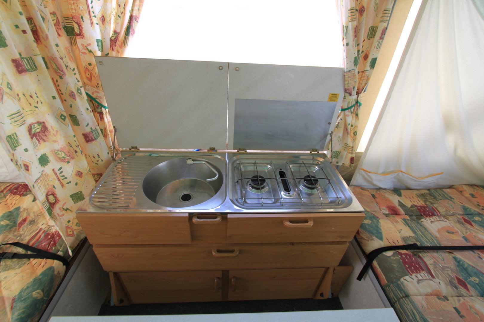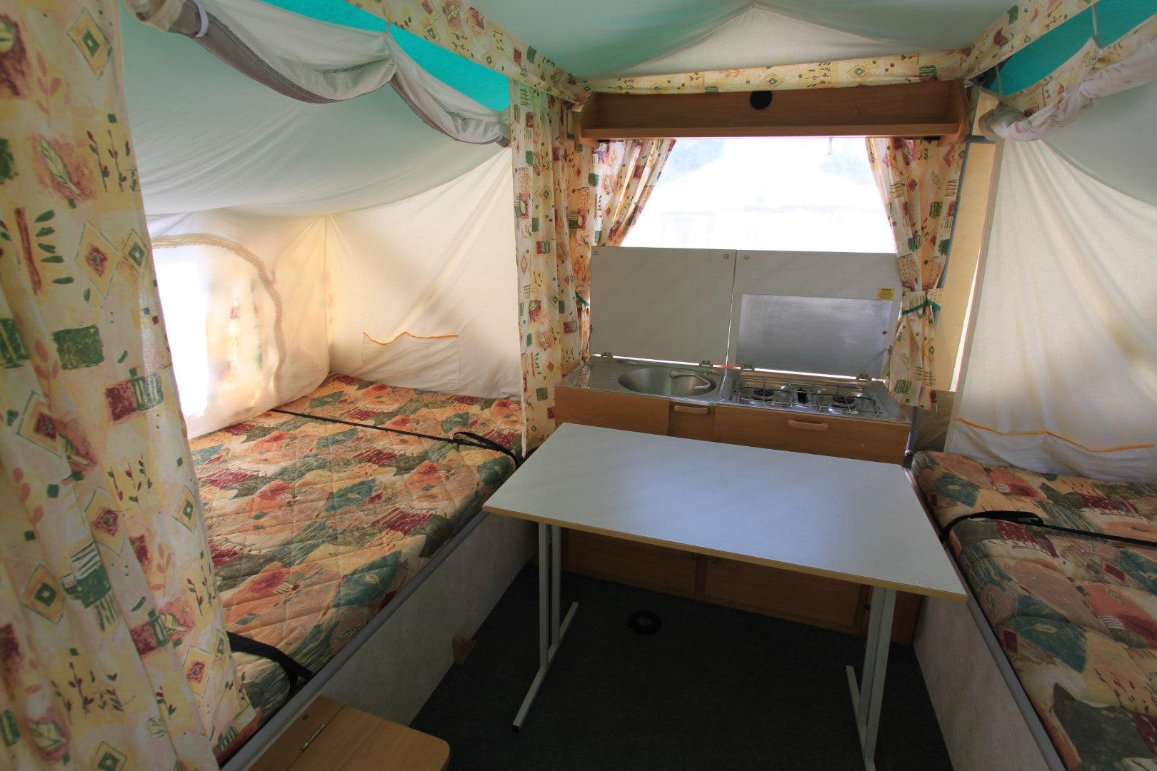Pennine Aztec – 2/4 Berth Folding Camper. Braked trailer. Cantilever Cooker unit, easy to put up and down ( no lifting ). Max towing weight of just 700kgs. Trailer comes with under bed storage skirt for one side. Trailer seems solid and tidy, canvas is in excellent condition, save for a couple of nicks here and there ( nothing of concern ). The main cabin erects quickly and as the canvas attaches to the trailer and bed boards ( unlike trailer ‘tents’ where the cabin canvas reaches to the ground ), there is no pegging of the canvas which means pitching can be either on grass or hard standing. Offered with full safety checks and with a 3 month warranty.
