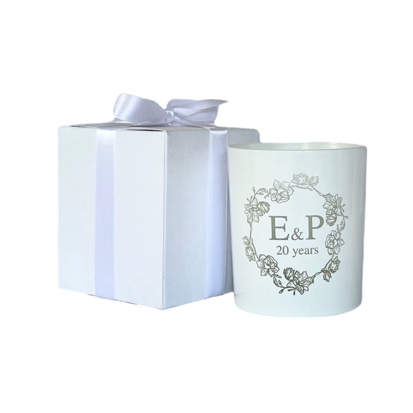 Atelier 38, Large Soy Candles, Luxury Large Candles, Large Scented Candles, Multiwick Candles, Big Soy Candles, Bergamot, Verbena & Basil, Large Natural Candles, Weddings, Events, Home Styling, Teachers gift, personalised gifts, gifts for friends, personalised candle – Personalised Anniversary Candle Gloss White – Orange & Patchouli – Atelier 38