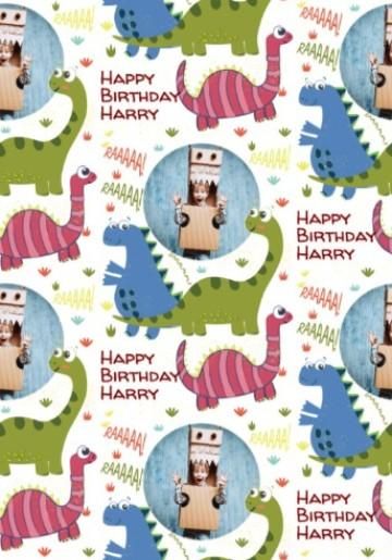 Personalised photo upload gift wrap featuring 3 friendly looking cartoon dinosaurs. Let your dinosaur enthusiast have a roar some birthday with this personalised birthday wrapping paper. Simply personalise with a special message for the birthday boy or birthday girl. Dinosaur roar! Raa!