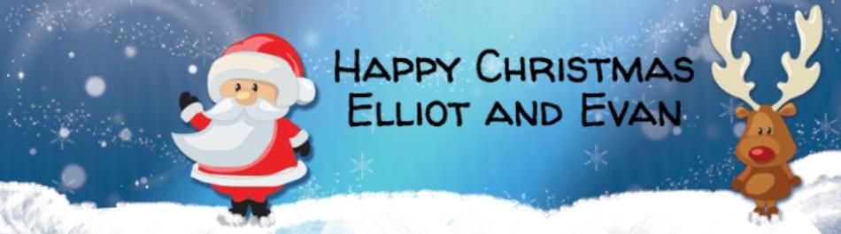 This personalised Christmas banner features a cartoon style Santa Claus and Rudolph stood on a snowy hill. The magic of Christmas is clear to see with twinkling lights and snowflakes brightly shining in the blue background. Why not add a photograph to make your Xmas banner more unique, a perfect way to say Merry Christmas with a personalised touch. Suitable for your Christmas party, your work Christmas party, and to help make your shop have that Christmas feel