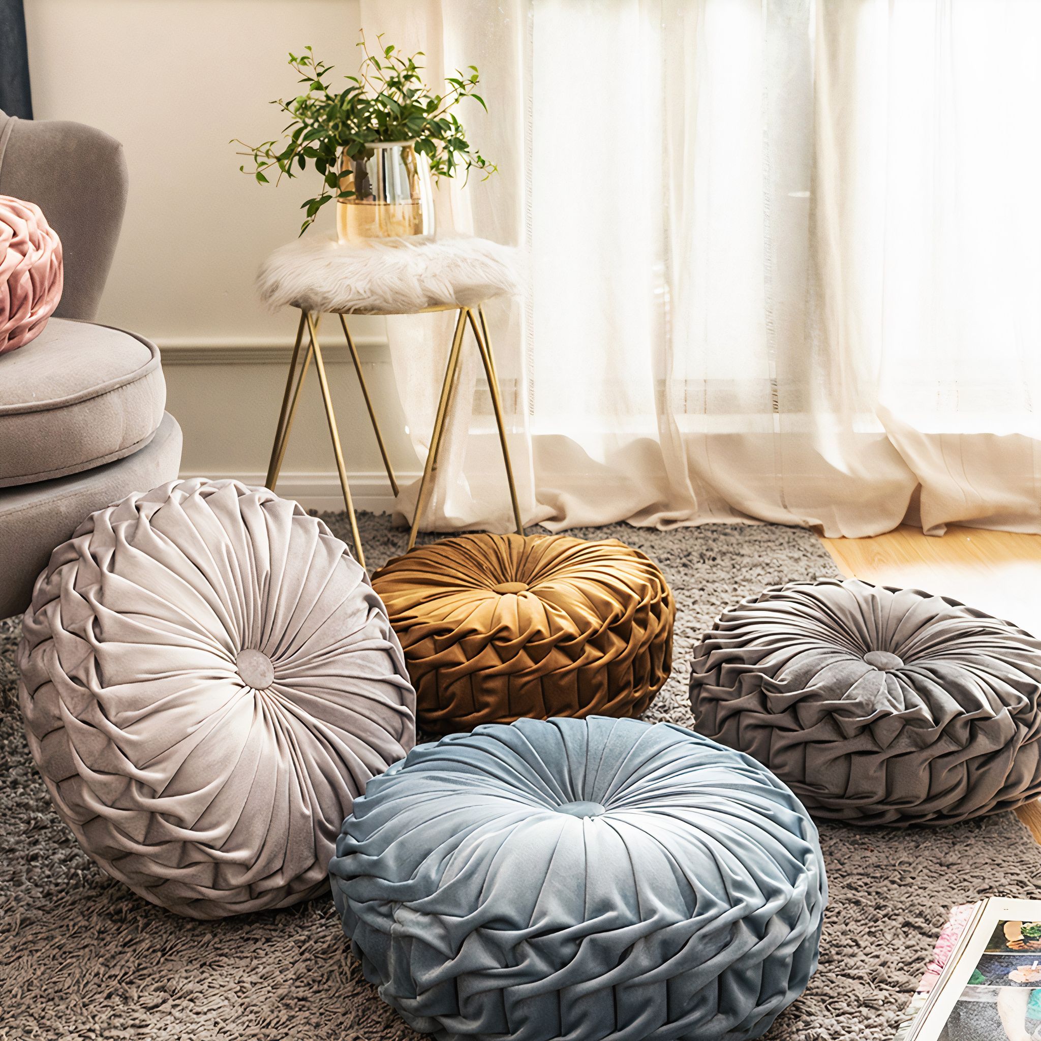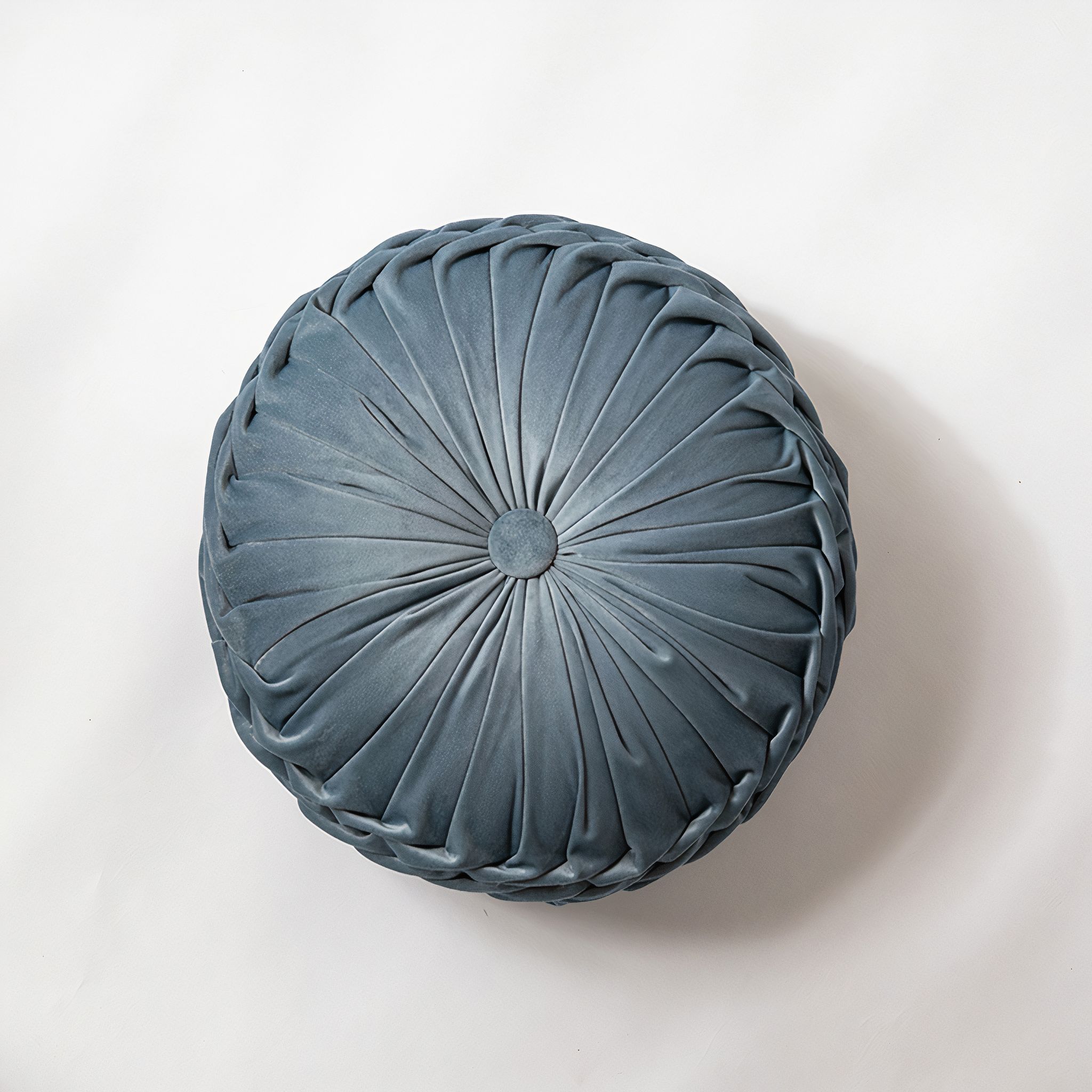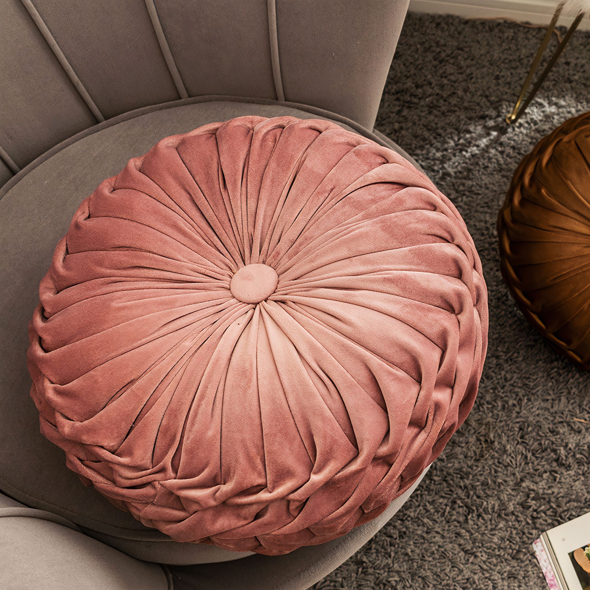 Accessorise any room with this lavish round velvet pleated cushion with filling. Featuring a pleated patterning into a central button, this beautiful cushion is available in a range of indulgent shades. Inspired by vintage designs, our sumptuous round ruched cushions are made of luxurious, rich velvet and finished with a simple button detail. Pleated Velvet Cushions – Sand Yellow – The Trouvailles