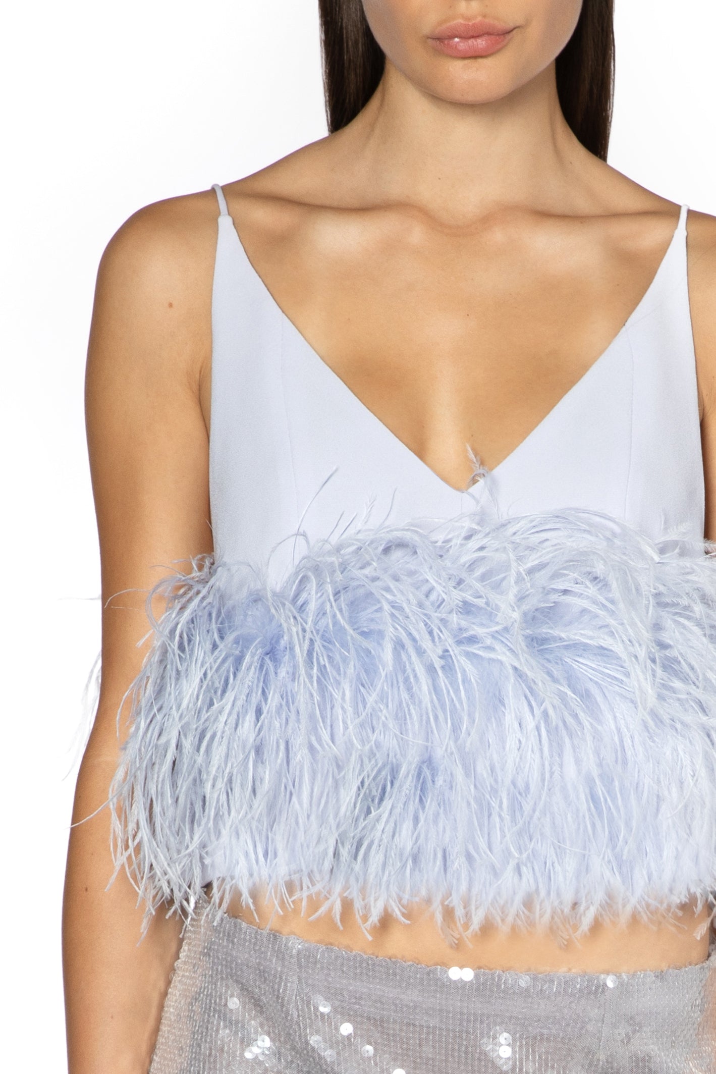 THE POPPY CAMISOLE IN LAVENDER HAS THIN SPAGHETTI STRAPS AND A LOOSE FIT THAT LEADS TO AN OSTRICH FEATHER TRIM AT THE WAIST. IT HAS A PLUNGING NECKLINE AND A LOW OPEN BACK, FASTENED WITH A CONCEALED ZIP AT ITS SIDE.Â