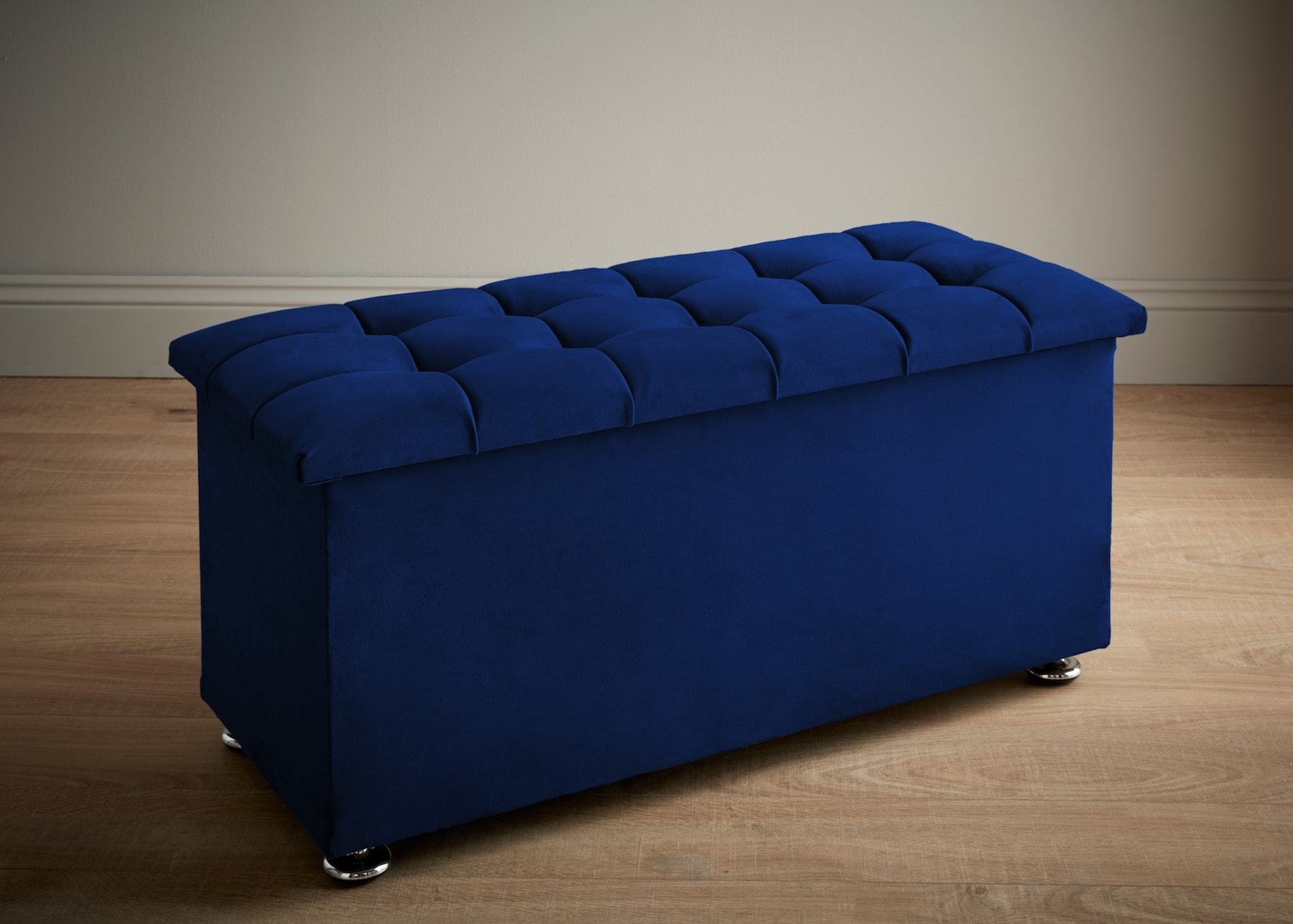 This storage ottoman is inspired by the deep quilting of the original Chesterfield design and built in our British workshop by hand. The fabric is comfortable and dureable. The lid opens to reveal a storage space. Portabello – Torino Ottoman – Royal Monaco Velvet Small – High Quality Velvet – Blue – Tufted – Small