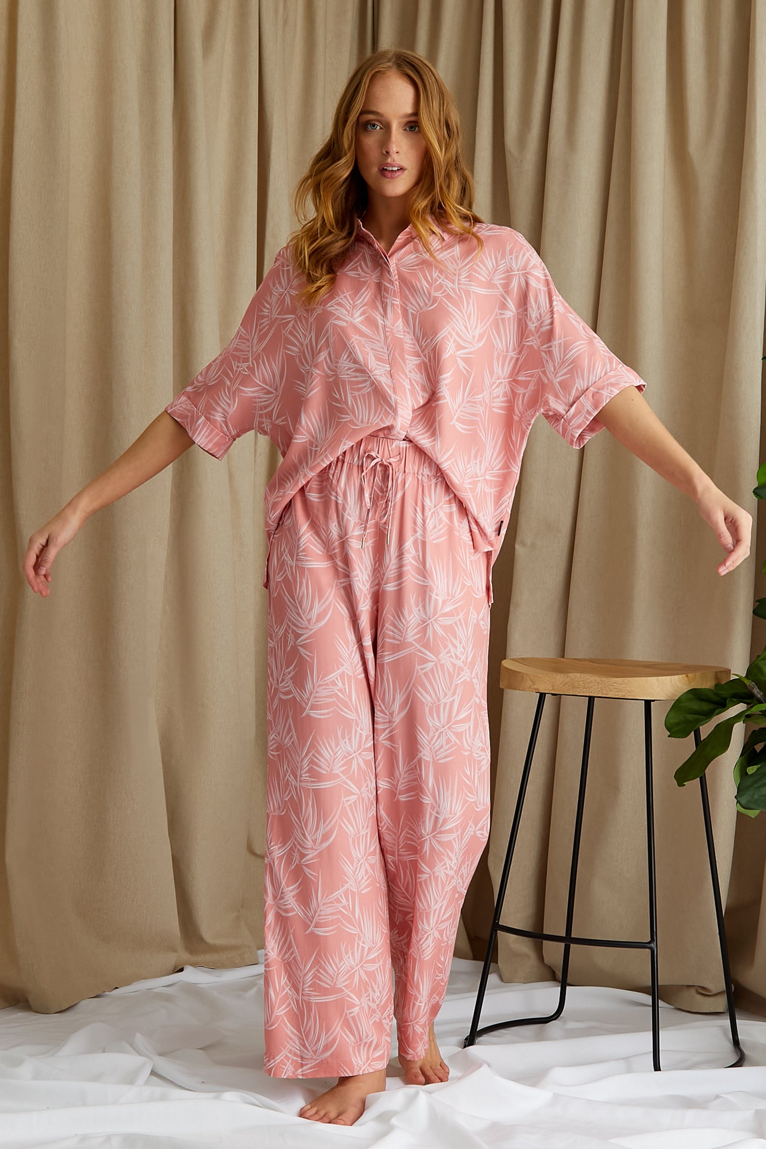 Oversized, boyfriend shirt with button fastenings Wide leg trouser for a breathable fit Summer inspired palm print Taking inspiration from far-away places, summer sun and late afternoon cocktails, the Printed Studio collection takes us straight into the mind space of relaxation. An elegant tonal palm print adorns the soft viscose. The full-length pyjama set features a wide-leg trouser with elasticated, comfortable waist and oversized, boyfriend shirt with a button-up closing. Wear open over a camisole for a breezy style or buttoned up for a relaxed lounge look. Material composition: 100% viscose