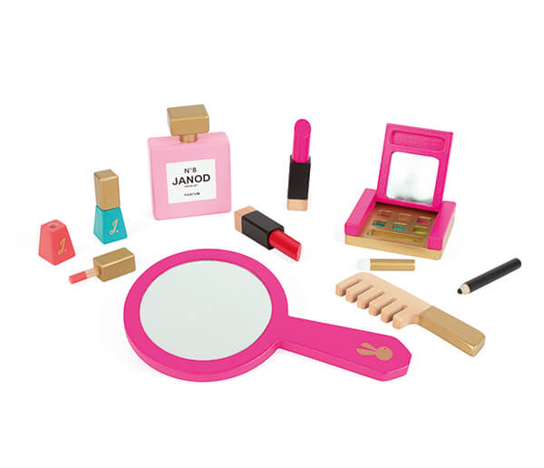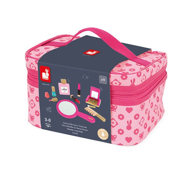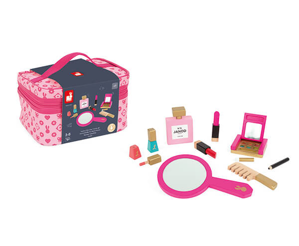 This set includes 9 wooden accessories a large mirror, a makeup palette with brush and built-in mirror, 2 lipsticks, 2 nail varnishes, 1 eyeliner pencil, 1 perfume bottle, 1 brush. Delivered in a lovely vanity equipped with a metal zipper and 2 fabric handles.