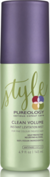 Take hair to the next level! Elevate fine hair with 24 hours of magnificent volume when paired with Clean Volume Shampoo.Pureology Clean Volume Instant Levitation Mist elevates hair with 24 hours of magnificent volume (when paired with Clean Volume Shampoo). This menthol-infused formula stimulates the scalp to maximize volume by providing root lift. The formula helps protect against heat damage and provides instant root lift and all-over fullness, and as always features the exclusive AntiFadeComplex to provide superior hair color protection. The Clean Volume system provides fine, color-treated hair with exactly what it needs – light, airy fullness, flexible movement and shine – and nothing it doesn t need like sulfates, parabens, or silicones that can weigh the hair down. Aloe water and soy proteins help nourish and infuse hair with clean-to-the-touch volume and a vibrant, shiny finish. BENEFITSLook Feel of Airy VolumeWeightless Formula24 hours of volume (when paired with Clean Volume ShampooSulfate Free/Paraben Free/Silicone Free100% veganAntiFade ComplexHow To UseApply 2-3 pumps throughout clean, damp hair, focusing on the root area. For maximum lift, blow dry the hair with a ceramic round brush. INGREDIENTSAQUA / WATER / EAU, BUTYLENE GLYCOL, AMP-ACRYLATES/ALLYL METHACRYLATE COPOLYMER, PEG-14 DIMETHICONE, PHENOXYETHANOL, PEG-40 HYDROGENATED CASTOR OIL, SODIUM POLYSTYRENE SULFONATE, PARFUM / FRAGRANCE, MENTHOL, ETHYLHEXYLGLYCERIN, PANTHENOL, HELIANTHUS ANNUUS SEED EXTRACT / SUNFLOWER SEED EXTRACT, HYDROLYZED VEGETABLE PROTEIN PG-PROPYL SILANETRIOL, TOCOPHERYL ACETATE, ASCORBYL GLUCOSIDE, XYLOSE, BENZOPHENONE-4, HELIANTHUS ANNUUS SEED OIL / SUNFLOWER SEED OIL, LIMONENE, LINALOOL, BENZYL SALICYLATE, HYDROXYPROPYLTRIMONIUM HYDROLYZED WHEAT PROTEIN, COUMARIN, BENZYL ALCOHOL, CAMELLIA SINENSIS LEAF EXTRACT, GLYCERIN, MELANIN, EUCALYPTUS GLOBULUS EXTRACT / EUCALYPTUS GLOBULUS LEAF EXTRACT