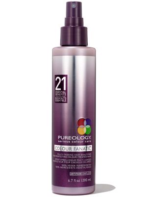 The spectacular hair spray that gives your hair not just one, not two, but 21 essential benefits! Keep your hair vibrant, shiny, healthy, protected and strong with Pureology Colour Fanatic. Key IngredientsFennel Seed Extract, a natural plant extract and powerful antioxidant, offering environmental protection for hairKeravis, a vegetable-based protein known for its strengthening propertiesXylose, derived from sugar, protects hair from heat-styling damageCamelina, Coconut, and Olive Oil, a blend of natural oils that offer light weight conditioning, smoothing and anti-frizz resultsCOMPLETELY FREE OF Salt, Parabens, Colorants, Drying Alcohols, Mineral Oil, DEA (Diethanolamine)Colour Fanatic 21 Essential BenefitsHair Color Protection, Leave In Conditioner, Hair Detangler Spray, Blow Dry Spray for Quick Drying, Moisturizer for Dry Hair, Helps Reduce Hair Porosity, Conditions Weightlessly, Hair Cutting Lotion, Split End Treatment Prevention, Hair Breakage Treatment from Daily Brushing Combing, Strengthens Hair Fiber, Repair and Protect Heat Damaged Hair, Shields Hair Against Environmental Damage, Hair Smoothing Treatment, Silky Hair Treatment, Seals Hair Cuticle, Reduces Dryness, Anti Frizz Hair Spray, Reduces Hair Static, Hair Refresher Spray for Restyling, Hair Shine Treatment.