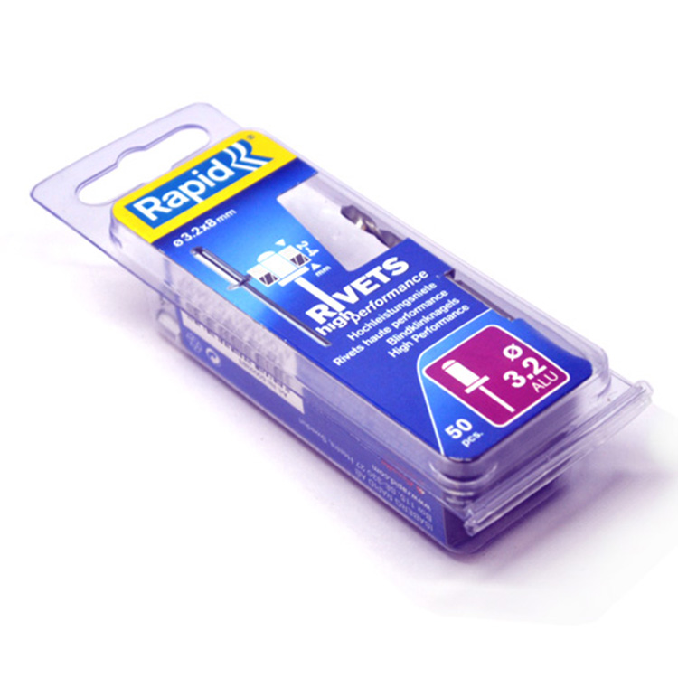 Rapid 3.2 Aluminium Rivets for MetalworkThe Rapid High Performance Aluminium Rivets have high grade aluminium heads and steel pins. Ideal for all applications, these extra strong multipurpose rivets ensure a permanent fix. They are ideal for use on licence plates, mudguards, metal and plastic coverings, name places, metal sheets and repair work.Each pack is supplied with a drill bit.Suitable for use with the RP10, RP40, RP60 and RP100 riveters.Specifications:Size: 3.2 x 8mm.Grip range: 2-4mm.Pack: Blister of 50 Rapid – 3.2 Aluminium Rivets for Metalwork (8mm) – Siver Colour – Textile Tools & Accessories