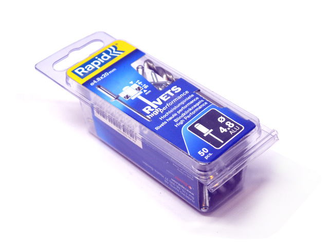 Rapid 4.8 Aluminium Rivets for MetalworkThe Rapid Aluminium Rivets are made from high grade aluminium to ensure a secure fix. They are zinc coloured to match licence plates on cars, vans, trailers and motorbikes.Each pack is supplied with a drill bit.Suitable for use with the RP10, RP40, RP60 and RP100 riveters.Specifications:Size: 4.8 x 14mm, 18mm or 25mm..Grip range:åÊ8-20mm.Pack: Blister of 50. Rapid – 4.8 Aluminium Rivets for Metalwork – 20mm – Silver Colour – Textile Tools & Accessories