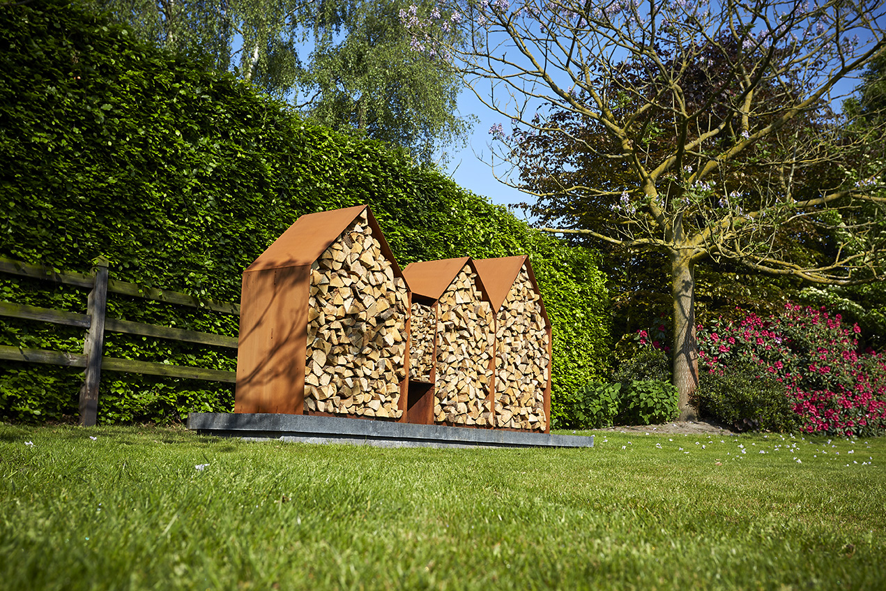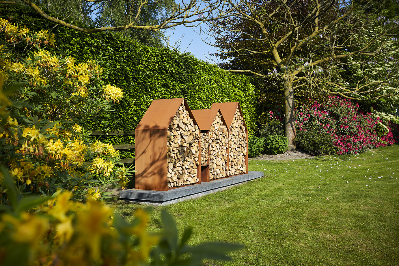 All too often firewood is piled up in the backyard, preferably out of sight behind a hedge or under a makeshift roof. This while stacked wood can give a very nice picture in the garden. From this basic idea, the Belgian designer Jan Kuppers developed ‘Bruges’, a storage space from CorTen steel where the natural beauty of stacked wood is combined with the rusted steel in a natural green setting. ‘Bruges’ took the form of the typical known Belgian façade construction. The design is built up of different modules so that it can be expanded to everyone’s individual needs.
