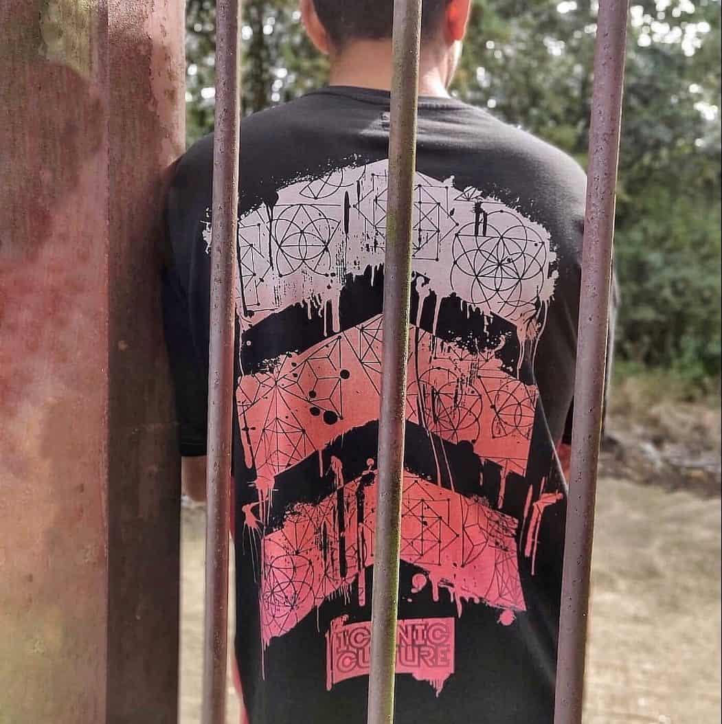 Detail: Black panel tee with red drip chevrons print on the back and red drip logo on the front
