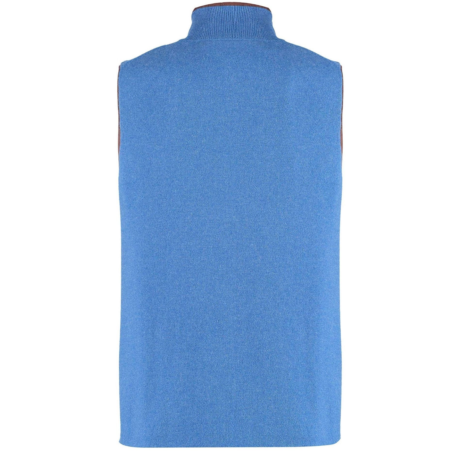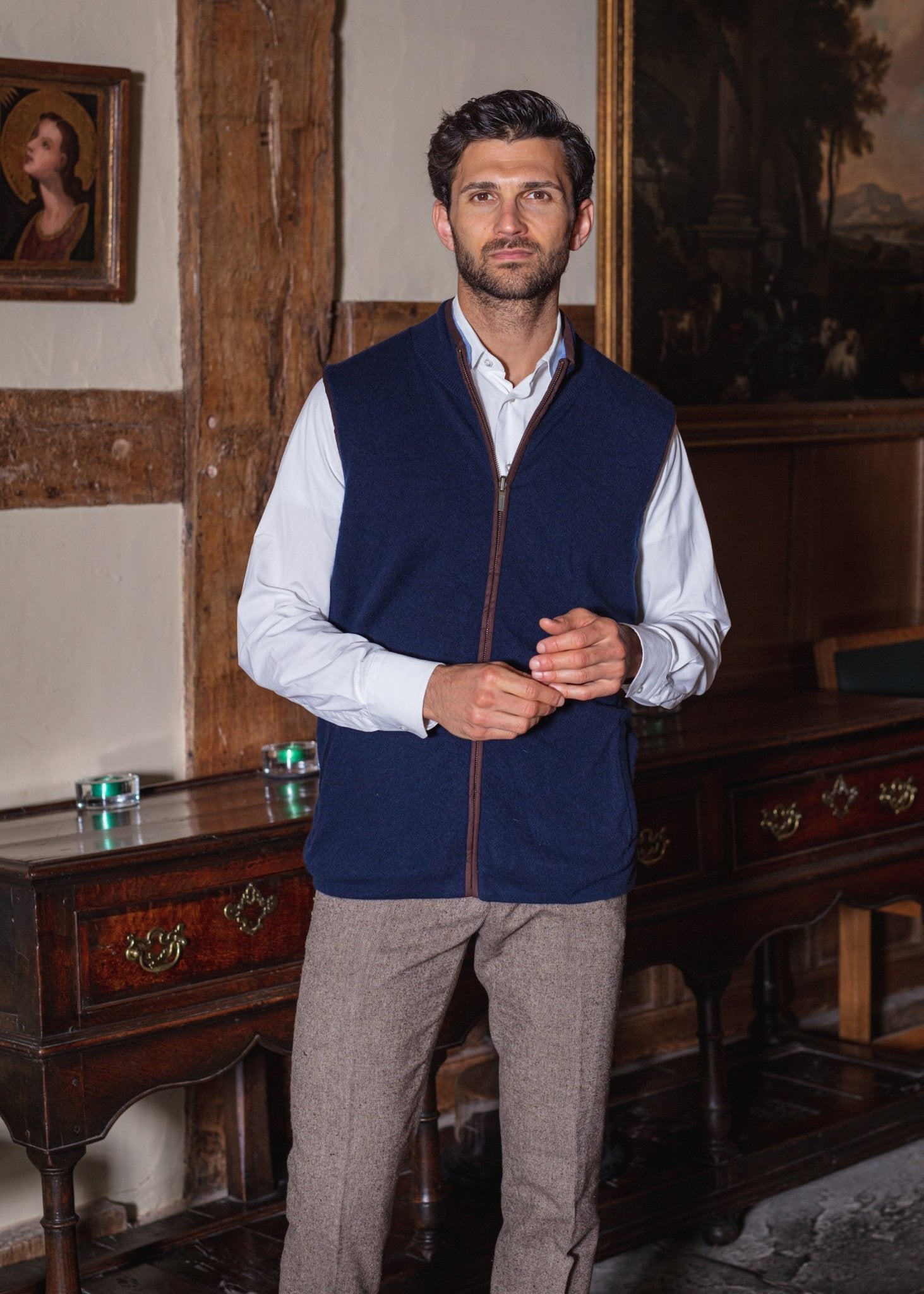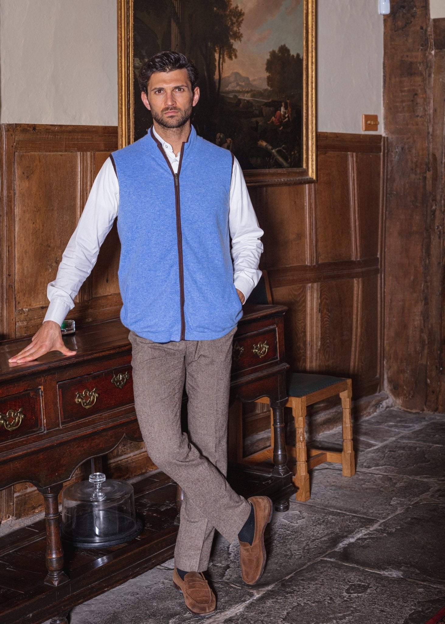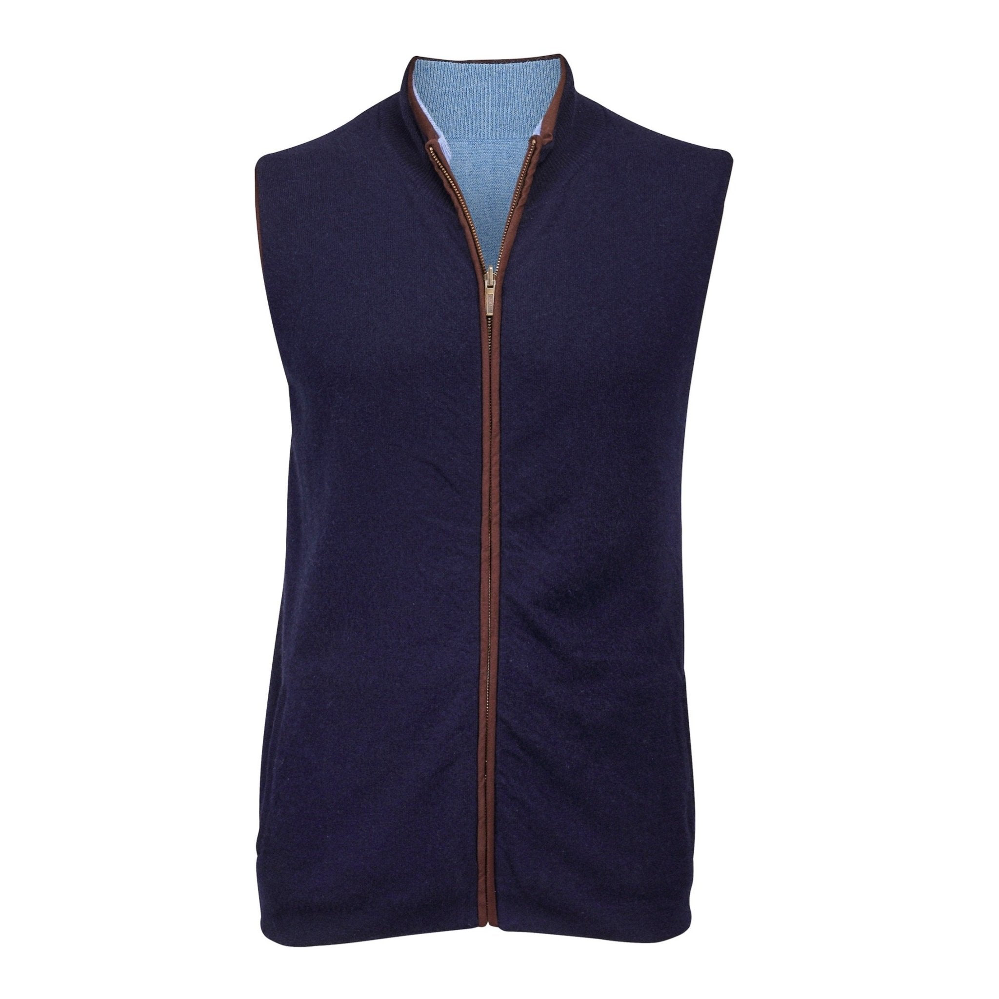 This fully reversible gilet is both versatile and comfortable. Suitable for use in the country or about town, this piece will soon become one of your favourite garments. It has pockets on both sides and a funnel neck with a contrasting alcantara suede trim. The gilet is made of double thickness, pure two ply cashmere. Double layer 2 ply pure cashmere Average length: 71cm Fully reversible Hand warming pockets on both sides Contrasting trim and pocket lining Available in a choice of eight colour combinations