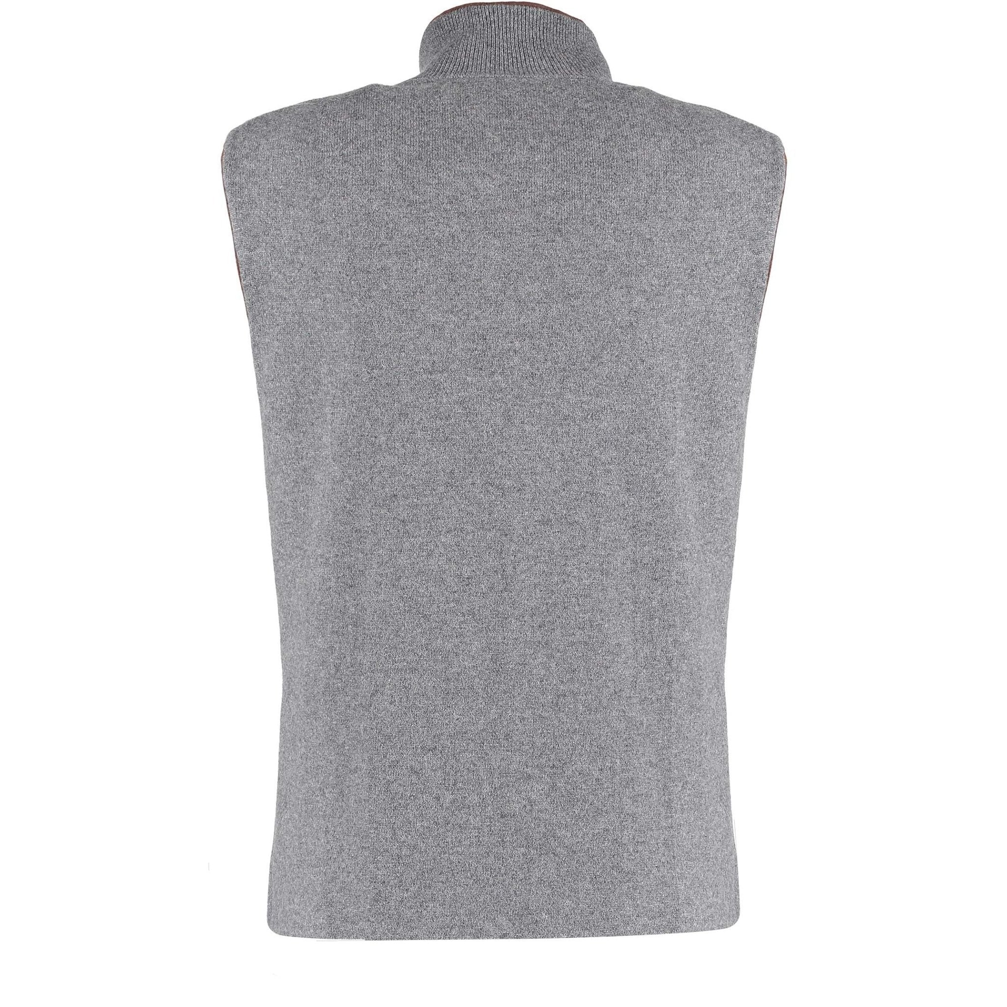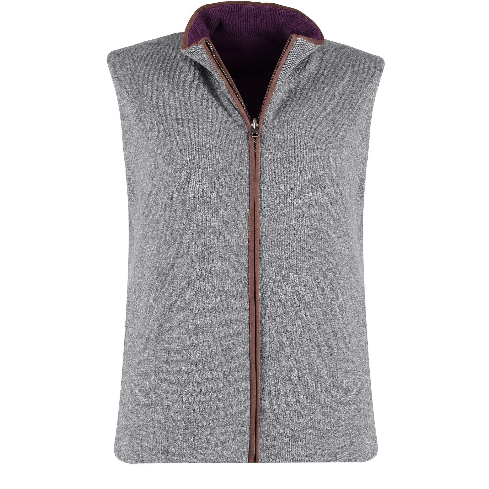 This fully reversible gilet has pockets on both sides and contrasting alcantara suede trim. Whether you are in the country or about town, this versatile garment is destined to become a firm favourite. Double thickness, pure two ply cashmere. **** Double layer 2 ply pure cashmere Average length: 63cm Fully reversible Hand warming pockets on both sides Contrasting alcantara suede trim Average weight: 440 grams