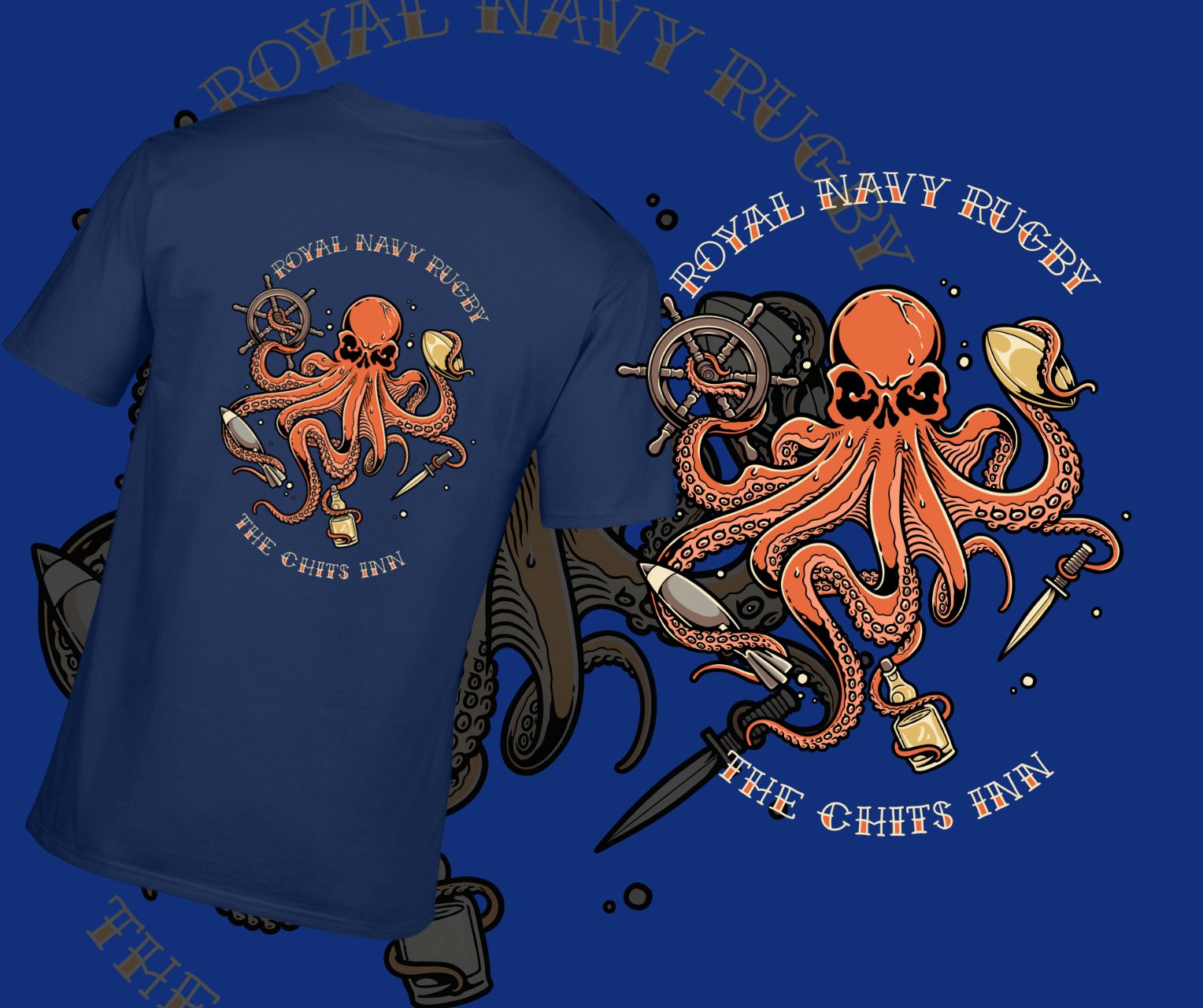 The Royal Navy Rugby 2024 T-Shirt is a casual wear item designed for supporters and fans of the Royal Navy Rugby team. The central feature of the design is a stylized octopus gripping an anchor-shaped rugby ball, symbolizing the strength and grip of the Royal Navy on the seas and in the sport. This unique graphic will be set against the classic navy color of the shirt, resonating with the team’s colors and maritime heritage.