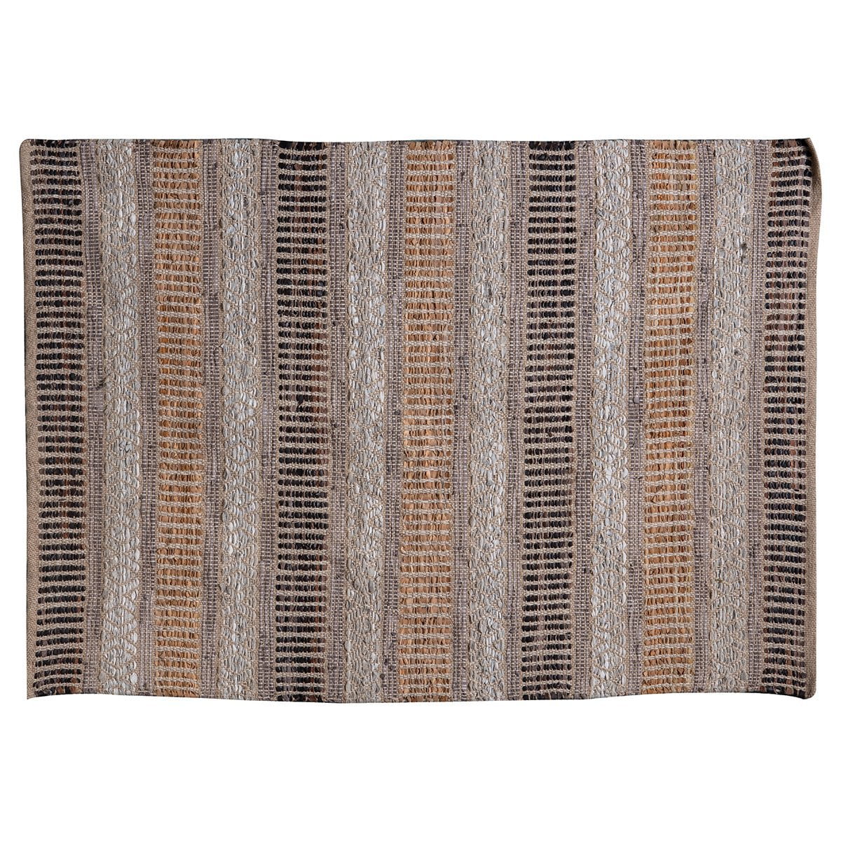 Add some texture to your interior with this striped hand loomed leather rug in a neutral colour palette. With fibre backing. Specification Care & Maintenance: Please see label for instructions Material: 60% Leather, 20% Jute, 20% Cotton Manufacturing Technique: Hand Woven Origin: India Pattern: Striped Style: Modern