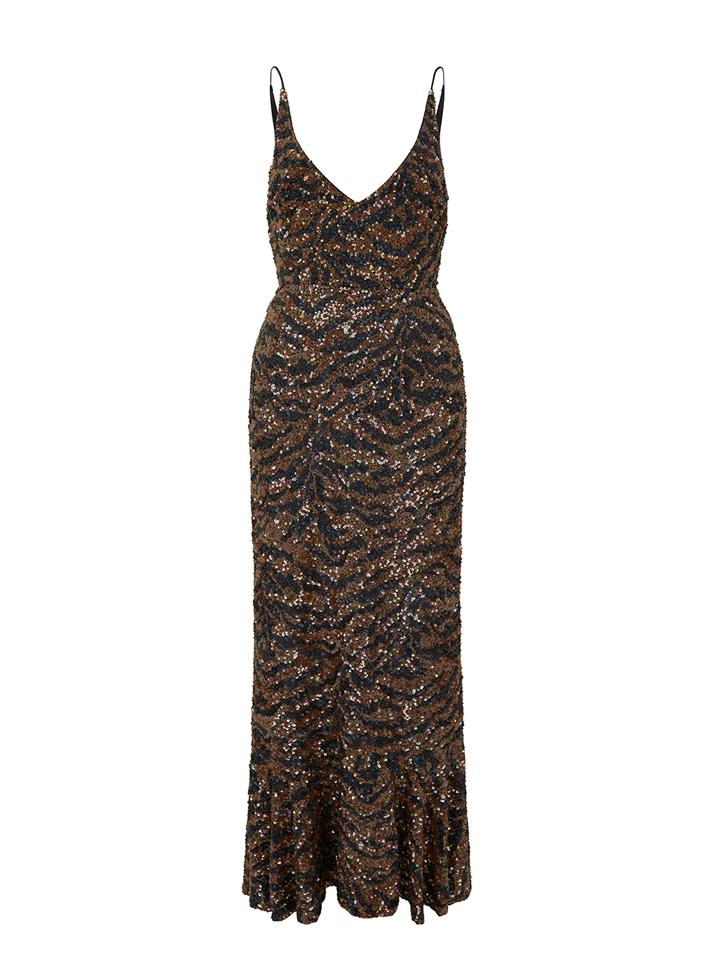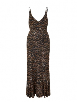 Aidan D midi dress sparkles with iridescent sequins embellished in bronze and black tiger pattern. Sculpted to a deep V-neckline both front and back, features slender shoulder straps and falls to a calf-length fluted hemline.