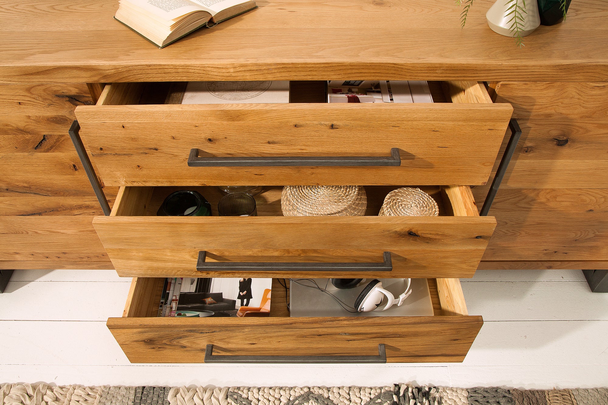 With the Viking, you bring a piece of really sturdy and robust furniture to your home. Made with wild oak wood elements and steel, the sideboard has an impressive presence and style. The anthracite metal frame and handles support the industrial look and go perfectly with the wooden body in the natural colour. Unevenness, knotholes, cracks and indentations are part of the design and create a charismatic effect. The sideboard offers plenty of well-thought-out storage space. It has four sizable compartments behind the doors and three spacious drawers. The large area on the top will be perfect for displaying your decorations or family photos.
