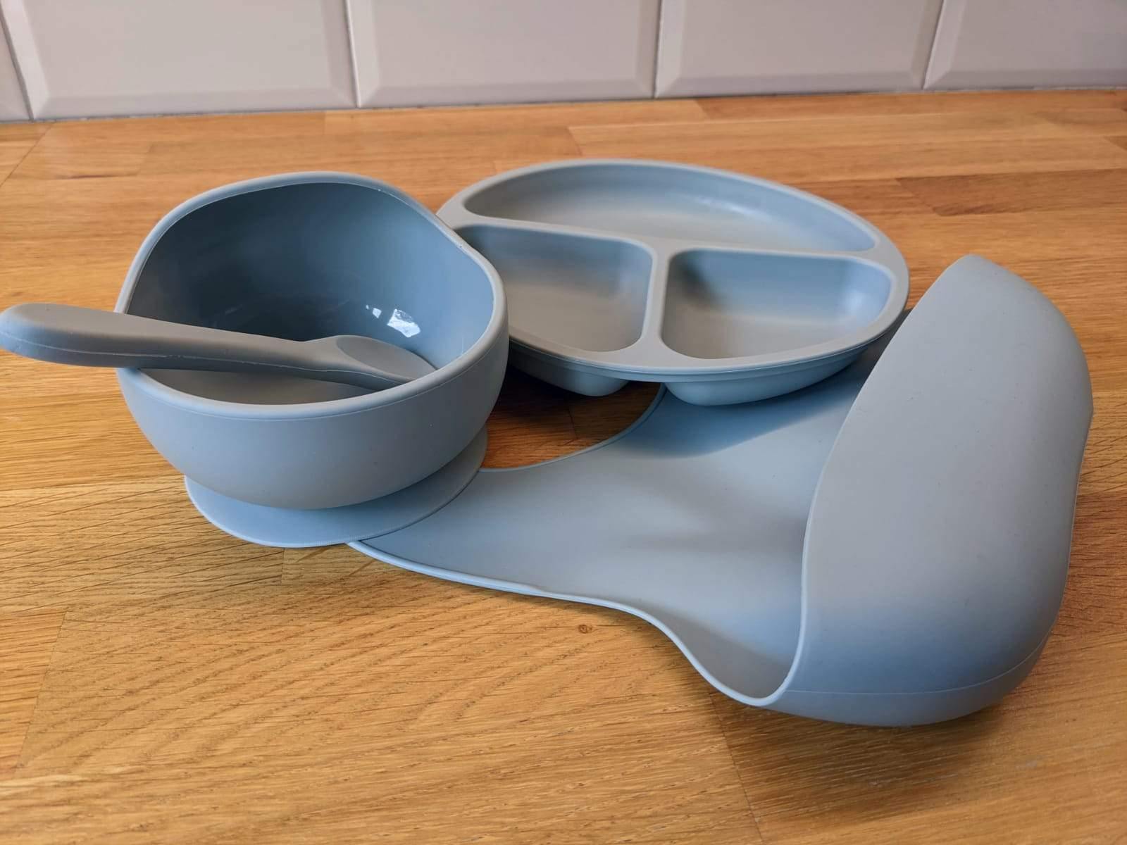 Avoid messy spillages with this complete feeding bundle. The food grade silicone suction bowl and non slip divider plate coupled with our trendy silicone spoon and crumb catching bib would make a great addition to feeding time and baby weaning journeys. The stylish bowl helps stop messy accidents with its suction base, and the sturdy but flexible silicone spoons are a perfect fit for little hands. The non slip divider plate comes in three sections which makes guessing baby and toddler portion sizes a doddle. This set is made from a high quality, hygienic material which is microwave and dishwasher safe. Silicone is non-toxic, stain and odour resistant, and extremely durable – designed to withstand even the messiest of children! Features material: 100% food grade silicone safety: BPA, lead and phthalate free. Free from substances which can cause allergies. bowl: suction base plate: non slip bib: catch all and waterproof bib stylish design and multiple pretty pastel and muted colour options spoon: silicone, designed for little hands suitable from 4 months Find out more about why we think silicone is best and take a look at our product care instructions.