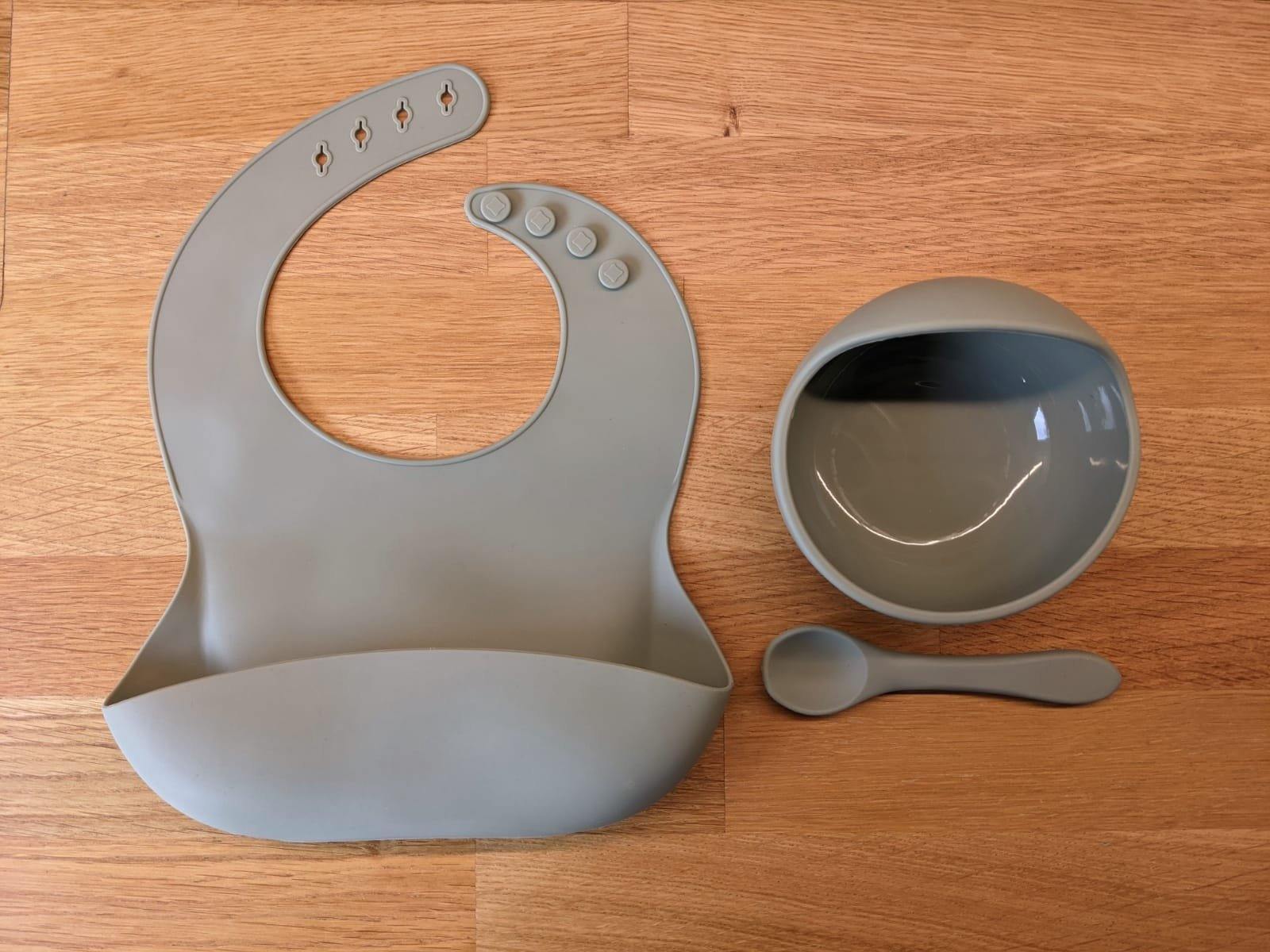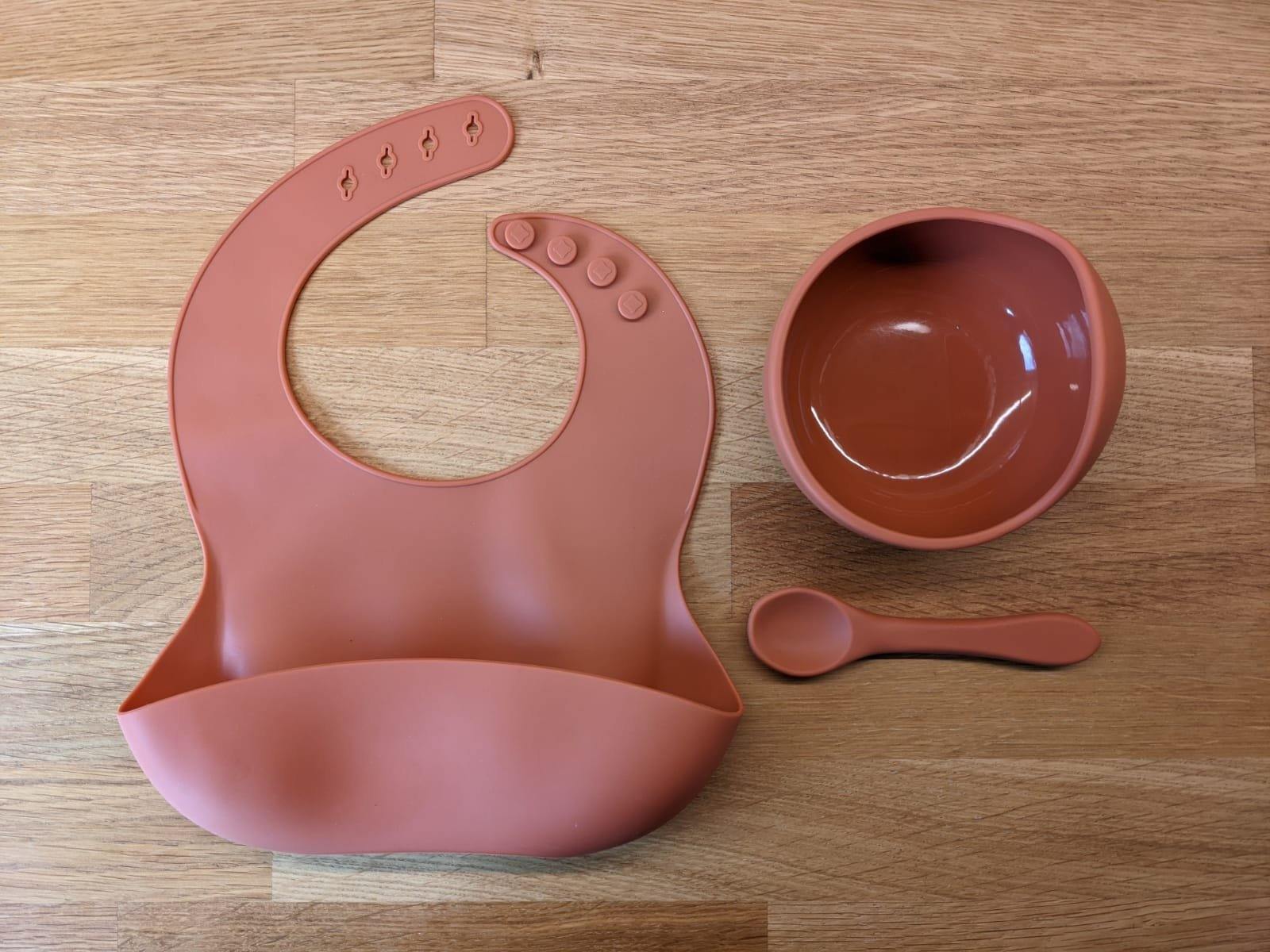 Silicone Suction Bowl, Bib Spoon Set Sale Rust – Children’s Silicone Tableware – Tiny Roo