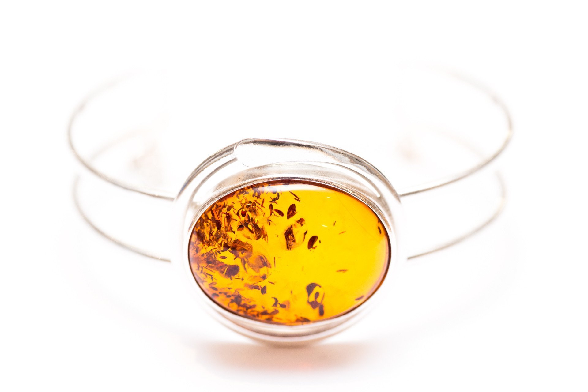 Simple & Elegant Baltic Amber & Silver Bracelet, fully adjustable in size and a truly stunning accessory. A statement arm cuff.Product: Baltic Amber & Sterling Silver BangleColours: Classic CognacMaterials: .925 Sterling Silver & Baltic AmberApproximate Dimensions of Amber center-piece: 26mm x 20mm x 8mmThis gorgeous amber stone bangle is available at an affordable price to all amber lovers. So simple, elegant yet at the same time absolutely stunning. The large, baltic amber piece is perfectly polished to create a smooth oval stone. The internal details collect at one size, leaving the other completely pure and translucent. The golden toned piece, is amazing – both in terms of its unusual shape but also it’s fantastic, light colour and its clarity. The silver design is just exquisite and contrasts brightly against the central amber stone. This bangle is an extremely, high quality product and would make a perfect accessory for those most important days or nights of your life. It is glamorous, fashionable and most of all simply striking.The bangle offers full adjustability, which means you can buy in confidence, thanks to its flexible, silver structure which allows for squeezing it tighter or loosening to fit your wrist perfectly.Find more of our beautiful Baltic Amber necklaces in our Bangles Collection!