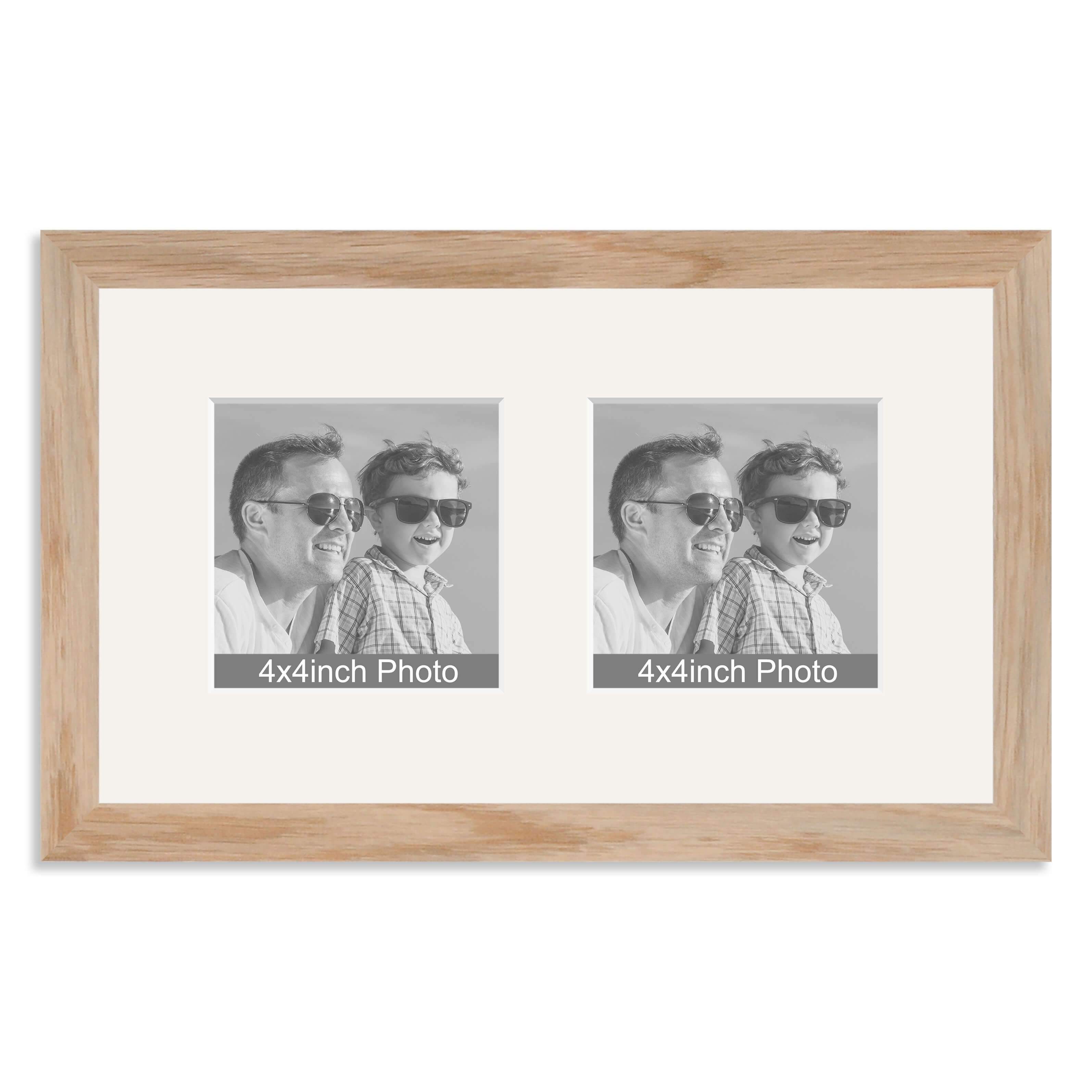 ThisåÊPhotoåÊFrameåÊcomes with a contemporary 20mm solid OakåÊframe, and is supplied with a multi aperture mount in a complementary off-white colour which holds two 4x4inch photos. åÊSupplied with clear picture glass, desktop stand and hanging hardware.The 12x7inchåÊsolid Oak Photo Frame is perfect for displaying two 4x4inch photos in any home or office environment.Ideal for Instagram photos.åÊFeaturesSolid Oak frame (no veneers)Wooden Frame100% Acid Free Off White Multi Aperture MountBevel Cut AperturesAccommodatesåÊtwo 4x4inch photosApprox. finished size isåÊ339 x 212mmSupplied withåÊrealåÊ2mm Picture Glass (not plexi glass)Can be hung or stood portrait or landscapeFrame fixings supplied for desktop display or wall mountingSKU: 072/OAKParcel size: Small