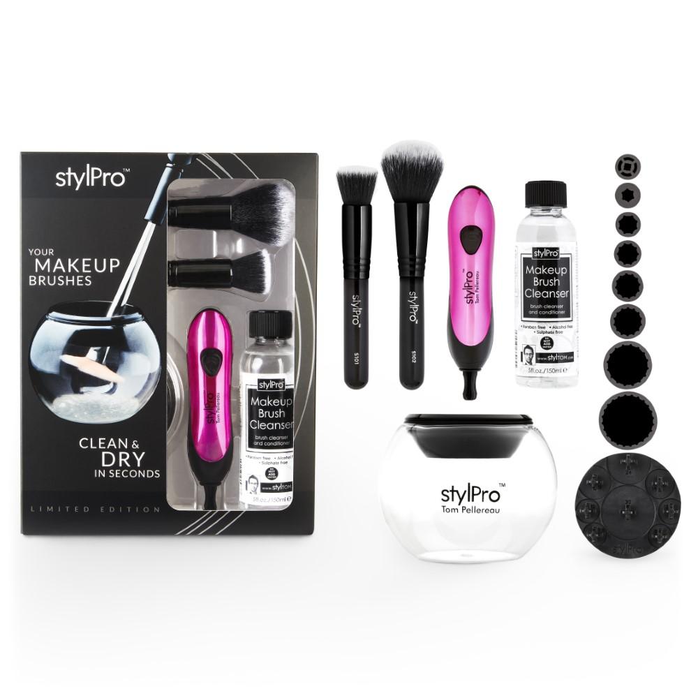 DOES IT COME IN PINK? ABSOLUTELY. When did you last clean your makeup brushes? To avoid build-up of germs, professionals recommend cleaning your makeup brushes once a week. The revolutionary StylPro device invented by BBC’s The Apprentice Winner Tom Pellereau uses centrifugal spin technology and is proven to clean and dry makeup brushes in less than 30 seconds. This stunning new Pink StylPro gift set complete with glossy black StylPro makeup brushes and a 150ml bottle of our incredible cleanser is everything any makeup lover needs for amazingly clean and dry brushes. Its the perfect gift! Includes: NEW Pink StylPro device 2 x Glossy Black StylPro Makeup Brushes Tritan unbreakable bowl 8 x Flexible silicone collars (30mm, 24mm, 19mm, 15mm, 11mm, 9mm, 7mm, 5mm) 150ml StylPro Makeup brush cleanser Instructions 2 x AAA batteries