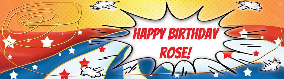 Superhero Superwoman style special occasion banner. The background contains stars, with a rope, and red, blue and white stripes. Ideal for Birthdays, Birthday parties, leaving parties, or just a crime-fighting super woman party. Ideal for children, teenagers or even an adult crime-fighter who hasn’t quite grown up yet party! Suitable for all ages including 13th, 18th, 21st, 30th, 40th and more! Why not upload a photograph of the special person to make the banner totally unique!