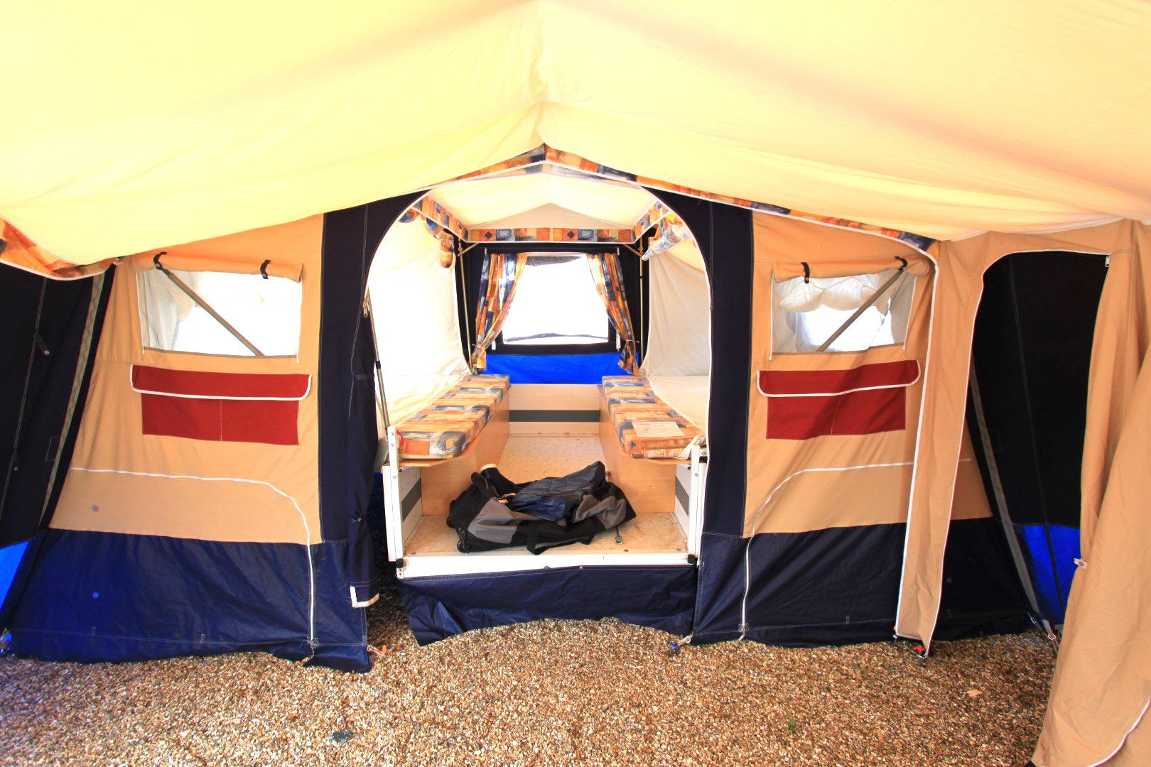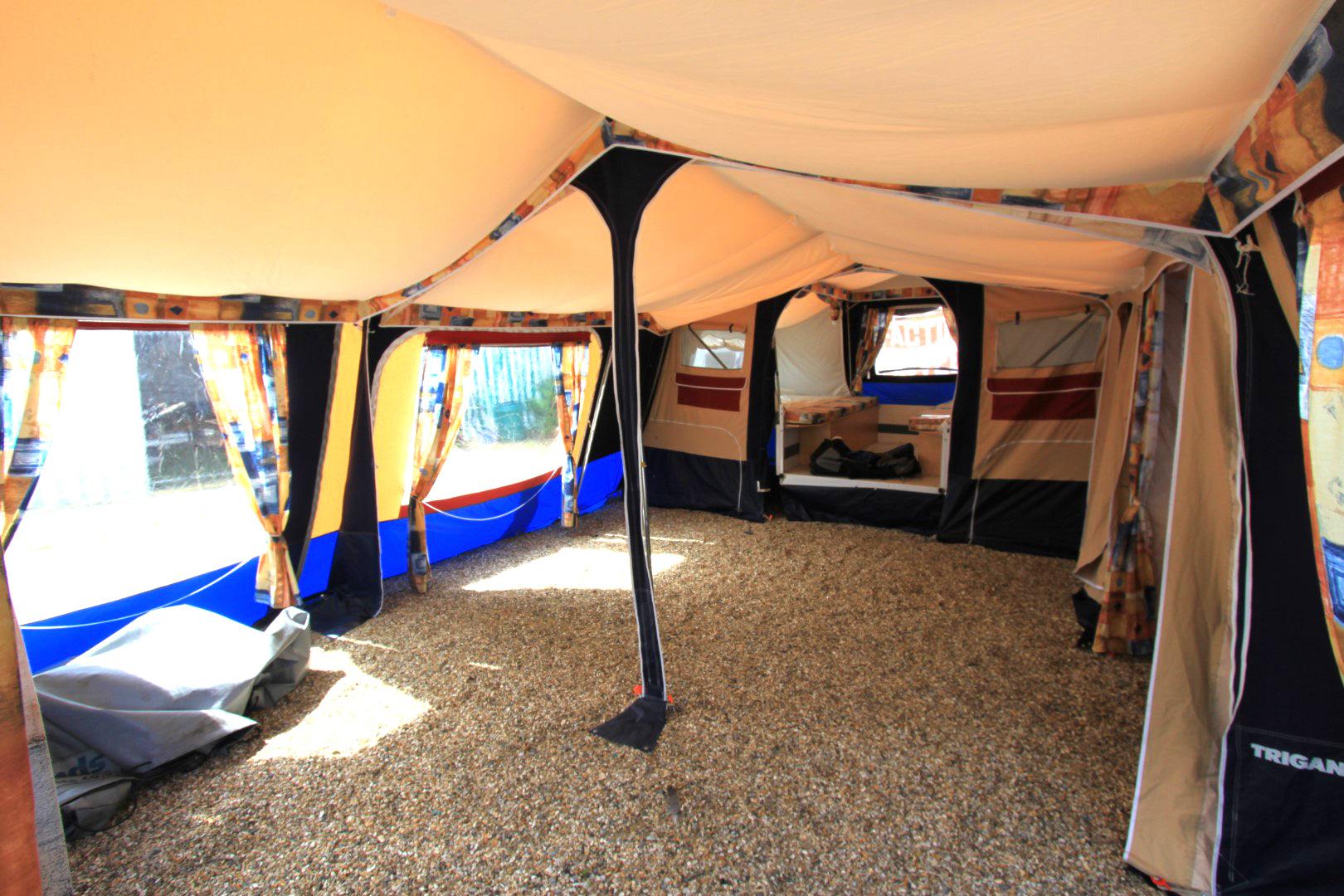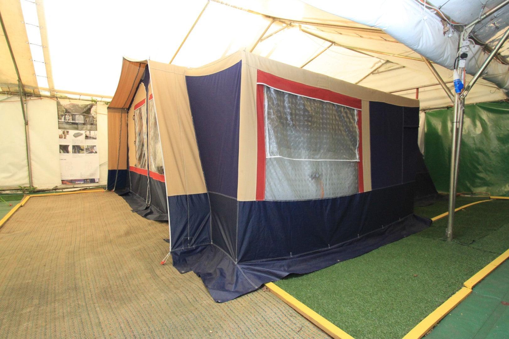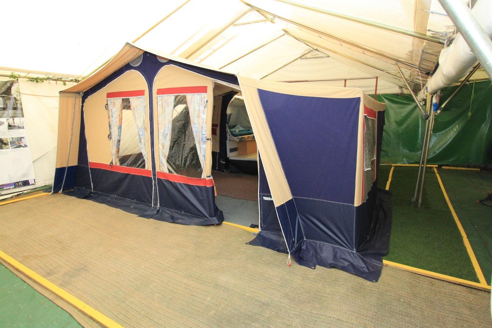 Trigano Chantilly – Lovely Family Trailer Tent Email us or call on 01202 893679 Family Trailer Tent. Lovely condition, excellent non faded canvas. Kitchen unit. Sleeps up to 4 people in 2 generous comfortable beds. Full awning plus optionally fitted short awning extension. Choice is to use either the main or the smaller awning or use them both ( as seen in pictures ).