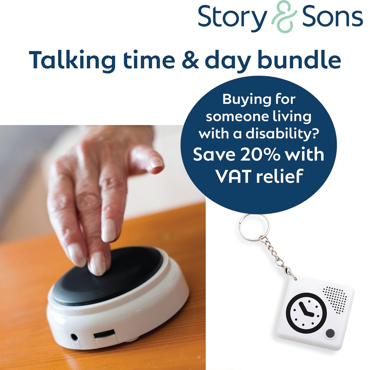 Save when you buy our bundles. This talking time and day bundle is great for someone living with a visual impairment or someone living with short term memory loss. Included is a Radio Controlled Talking Button Clock & the Talking Time Pal. Simply press the button once for the time and then press a second time for the day and date. If you are a carer of somebody that asks you what the time or day is all day long then this can help take the pressure off you. The Talking Time Pal works in exactly the same way, but is a much more portable version on a key ring.