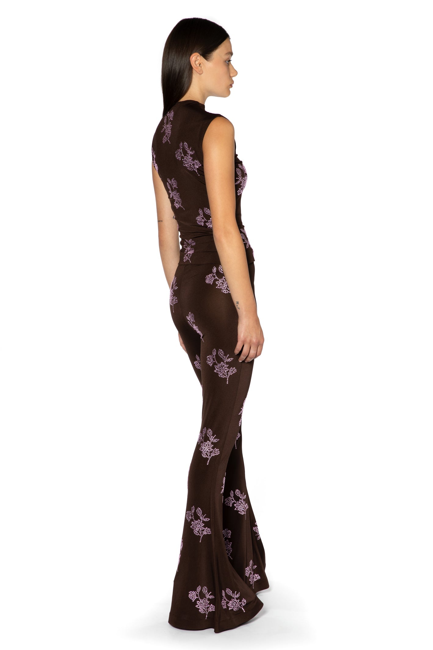 THE TANIA TOP IN BROWN WITH PINK CRYSTALS IS A SLEEVELESS DESIGN FEATURING A HIGH NECKLINE AND AN ALL OVER PLACEMENT CRYSTAL MOTIF. CUT IN A SLIM FIT WITH A SLIGHT STRETCH, IT PULLS ON OVER THE HEAD. PAIR WITH THE MATCHING KORO TROUSERS.