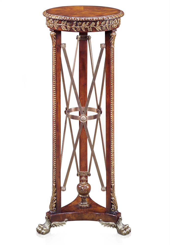 A carved and gilt torchère, the circular top with a carved edge and frieze, on three supports with acanthus bases and capitals, the whole supported on a trefoil concave base and raised on brass winged lions paw feet. The central 'x' form structure of stretchers in brass centred by a ring decorated with flowerhead paterae.