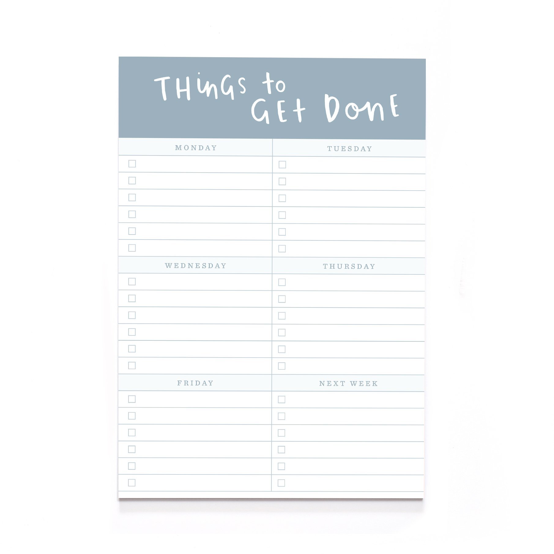 This simple, stylish and fun A5 notepad makes a perfect office gift and a great Christmas stocking filler. The ‘Things To Get Done’ A5 notepad has been illustrated and printed in the UK with 50 pages of 100 gsm paper and a grey board back. The hand lettered A5 notepad has been designed with a checklist for Monday to Friday, and a section to add notes for the following week. MADE FROM:Our notepad are printed using thick 100 gsm paper with grey board backing. The notepad has 50 pages. DIMENSIONS:A5 (21cm x 14.5cm)Please note that props are not included.