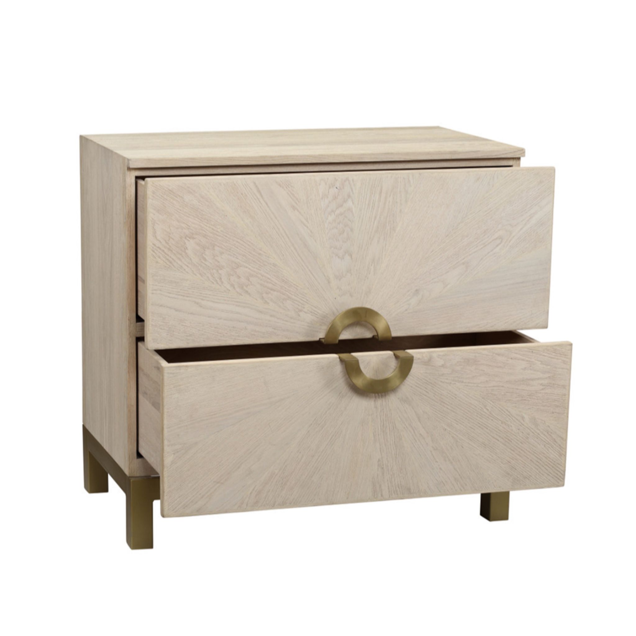 The Tilly Chest of Drawers in Oak exudes a bright and radiant glow to any room. Elegantly crafted in sunburst design and comes with gold-style metal base and handles, the two drawers provide great space to sort and store your clothes and other bits and bobs.