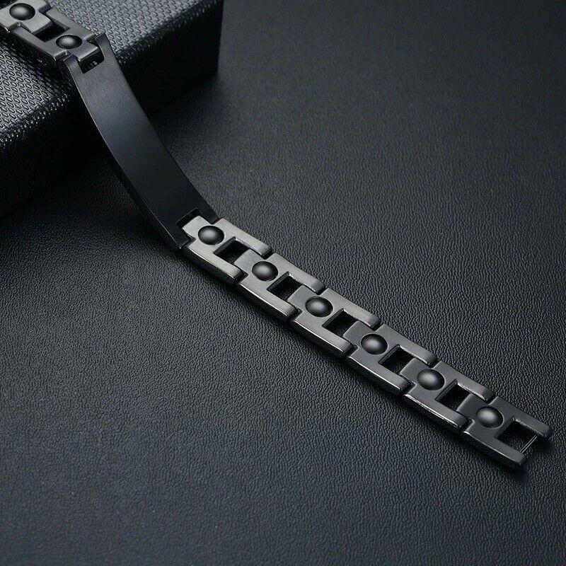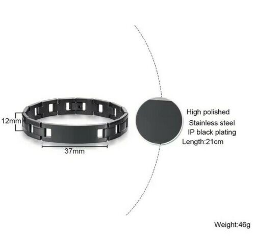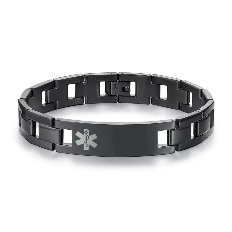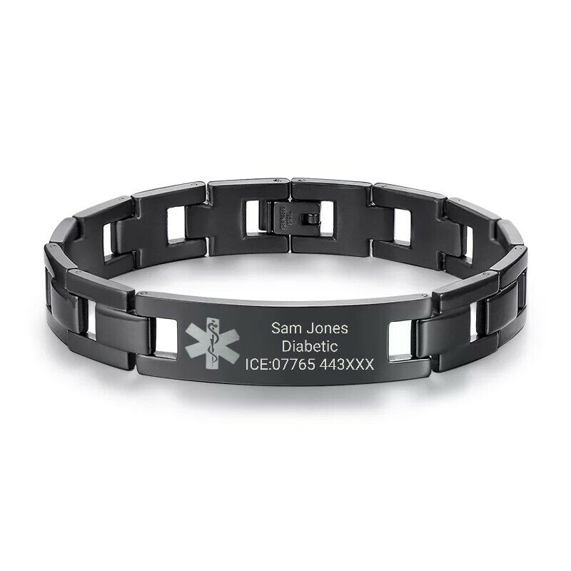 The Titan Slim is a stylish black plated stainless steel bracelet with a lovely matt finish. These customisable medical alert ID bracelets provide a smart casual look perfect for everyday wear. The band is hardwearing and has a strong buckle to fasten. Product Features: Style/Shape: Rectangular ID tagLength: 21cm Height: 1.2cmMaterial: Stainless SteelColour: Black Engraving Maximum of 4 lines with 25 characters maximum per line. Ensure you include any capital letters where you would like them as the text will be copied exactly as it has been provided. Please note that the more lines / letters added may result in the text to decrease in size. Customised bracelets cannot be returned unless delivered damaged or faulty. We ask that you ensure that the size is correct to your needs.