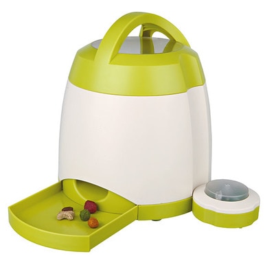 Memory Trainer Strategy Game demanding game for professionals: by pressing the remote control the dog gets the treats increasing levels of difficulty due to the increasing distance between release button and food dispenser, in the end they can even be placed in different rooms rotating reservoir inside the food dispenser with adjustable opening for adjusting the release of treats plastic additional holder to increase stability of release button various means of fastening the release button by suction cup or peg for outside includes small scoop for filling operating range up to 40 m non-slip due to rubber feet battery-powered (3 AAA micro batteries and 4 C baby batteries not included) incl. booklet with tips and tricks for designing optimal training Trixie – Dog Memory Trainer Strategy Game
