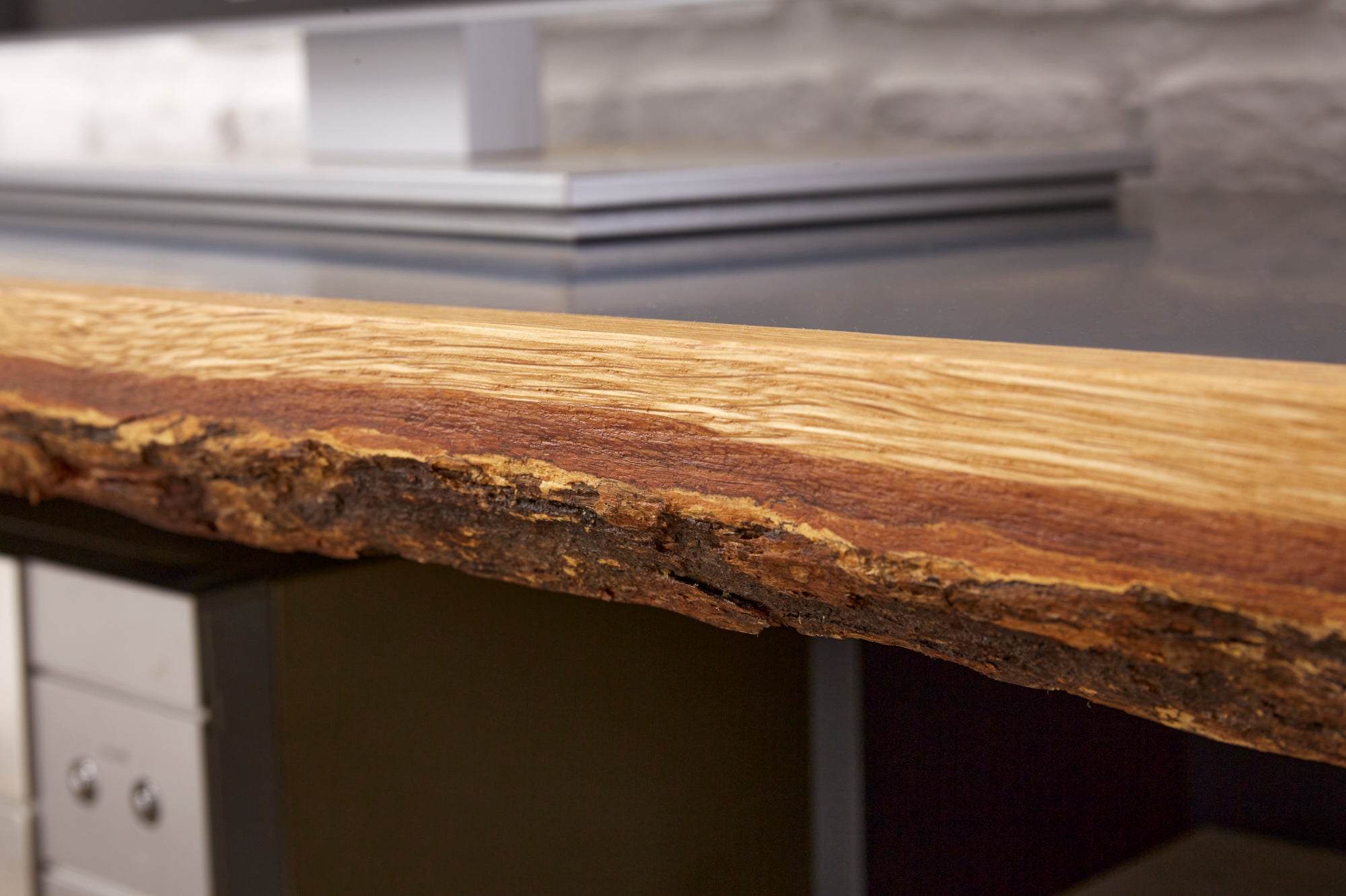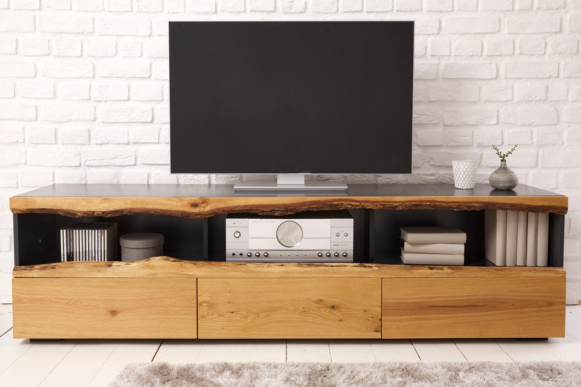 This extraordinary TV stand immediately draws everyone’s attention! This is mainly due to the unusual design of the board. Here, modern elements are combined with the rustic beauty of natural solid wood. The body of the low board was designed in an elegant matt grey and the front was decorated with solid oak panels. Even the bark was retained as a design element, so that the wood looks particularly natural. Framed by the individually shaped wood, the board has a large open compartment, which is divided by two partitions. Underneath there are also three spacious drawers with a practical push-to-open mechanism.