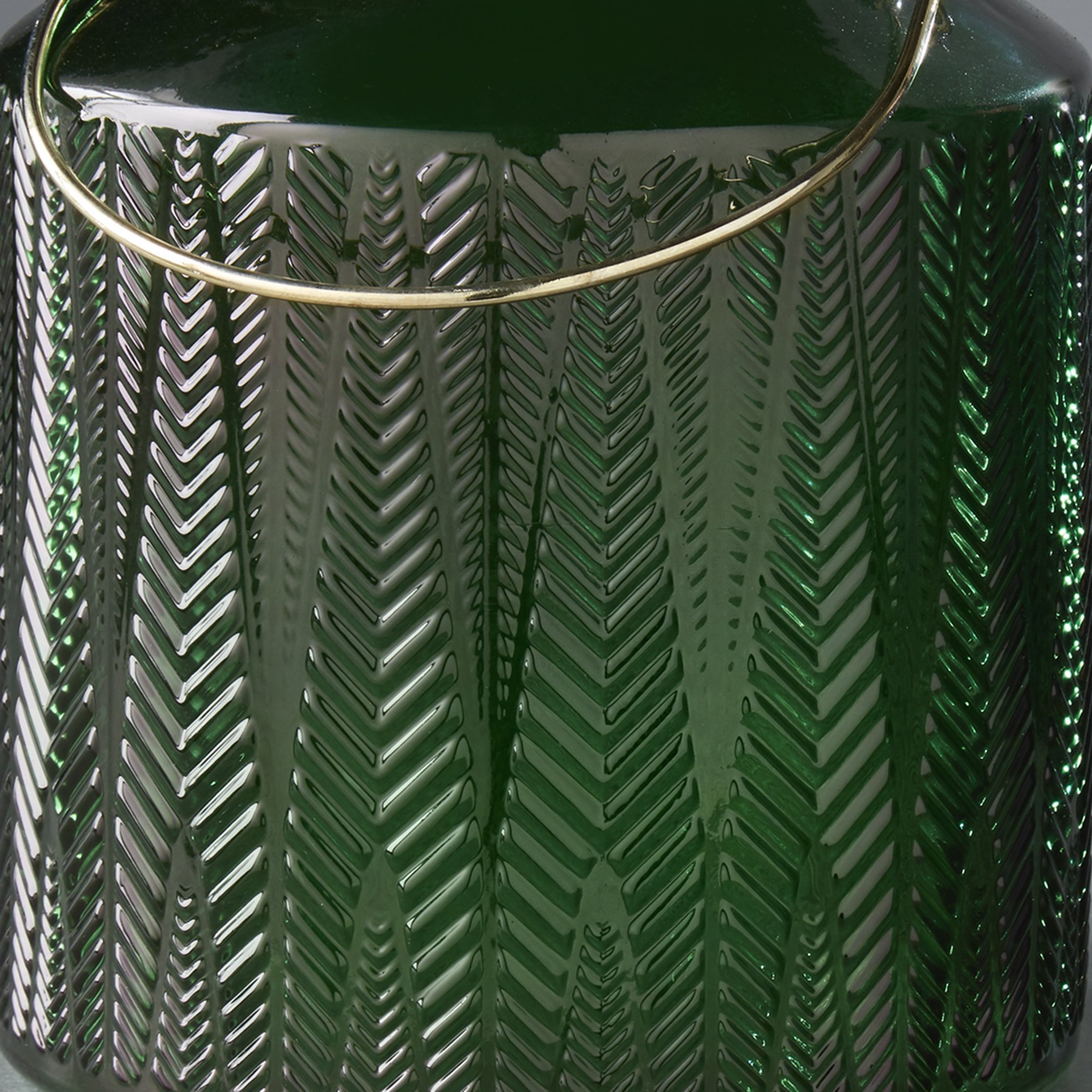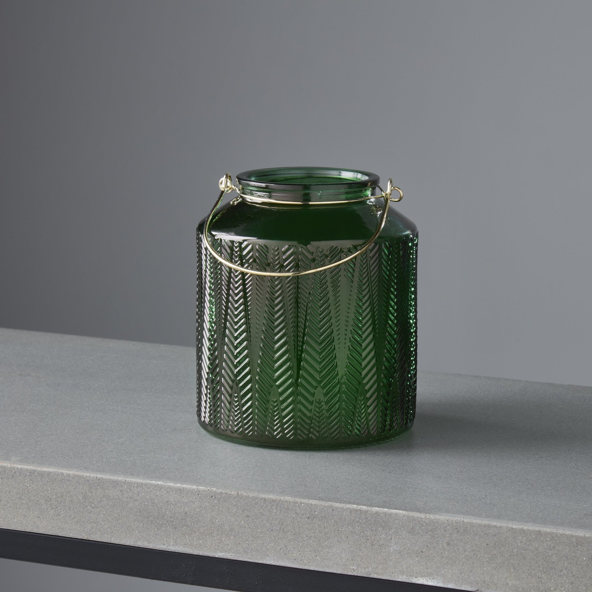 Calm and sensual, this stunning green glass candle holder is just the perfect accent to a peaceful and serene room. The modest gold metal handle adds subtle character and the textured glass radiates warmth and tranquillity from the candlelight and fills the room with serenity. Take this candle holder to a quiet place for a zen experience.