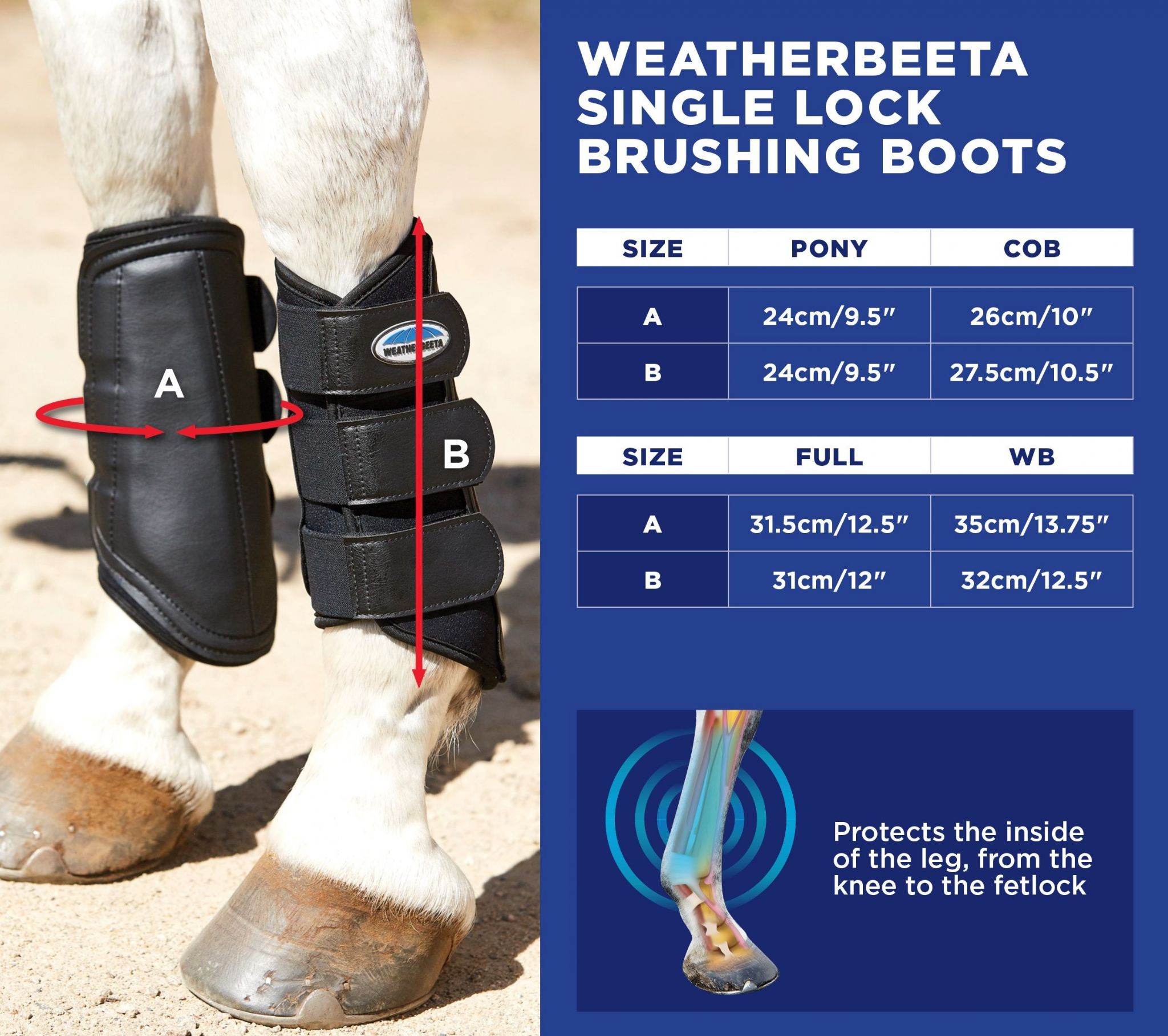 The WeatherBeeta Prime Single Lock Brushing Boots are soft, durable and breathable. Made from neoprene, the boots conforms to the horses leg for added comfort.The tough PVC strike pad provides extra protection against knocks and brushing.The adjustable touch tape closures are quick and easy to use.Two touch tape closures on Pony and Cob sizes, three touch tape closures on full size.Matching range available.