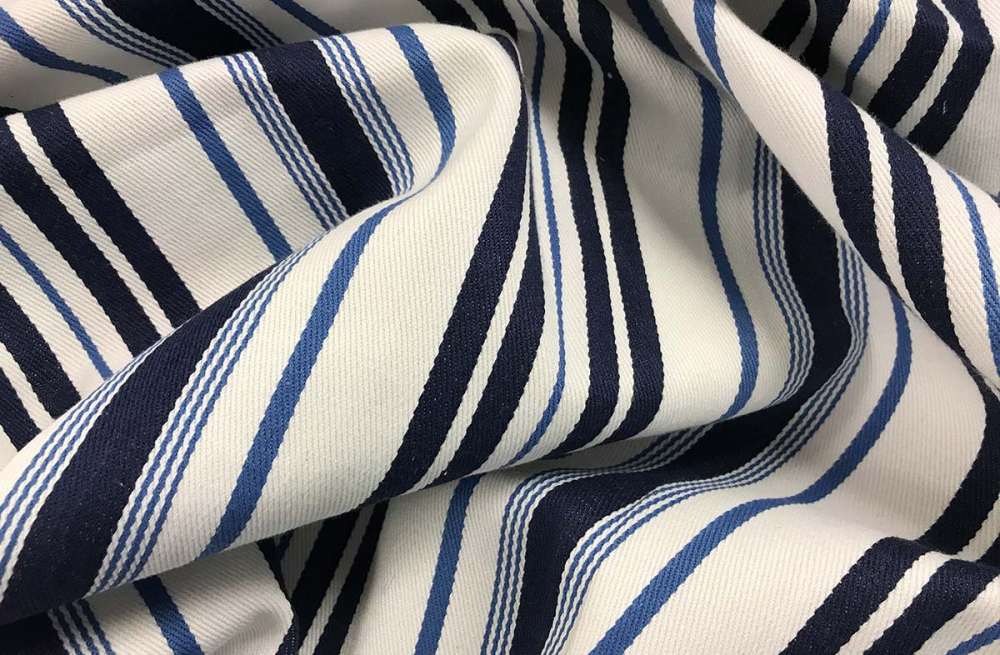 White, airforce blue and navy ticking striped fabric in 100% cotton stripes which is a lovely soft fabric suitable for any soft furnishing or decorative use.
