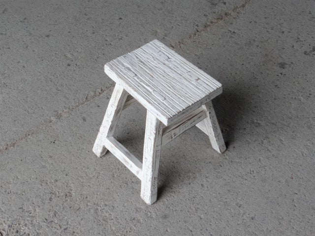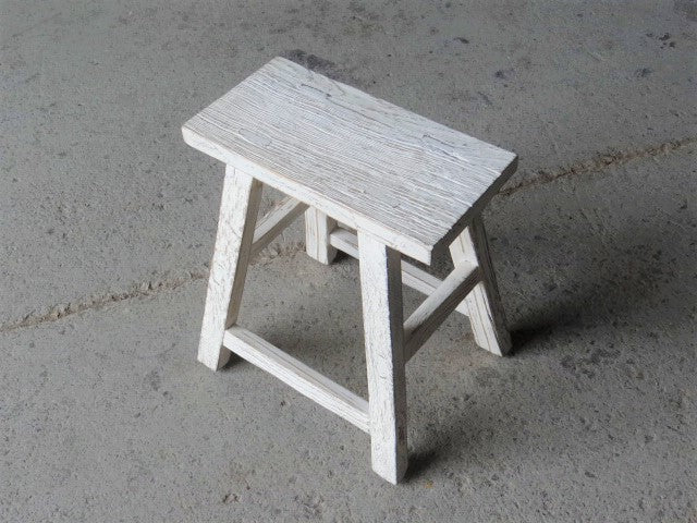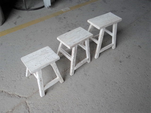 All of our stools are unique and have had their own practical journey through life. Our white wash stools are essentially our medium sized antique rustic stools with shabby chic white wash paint applied.
